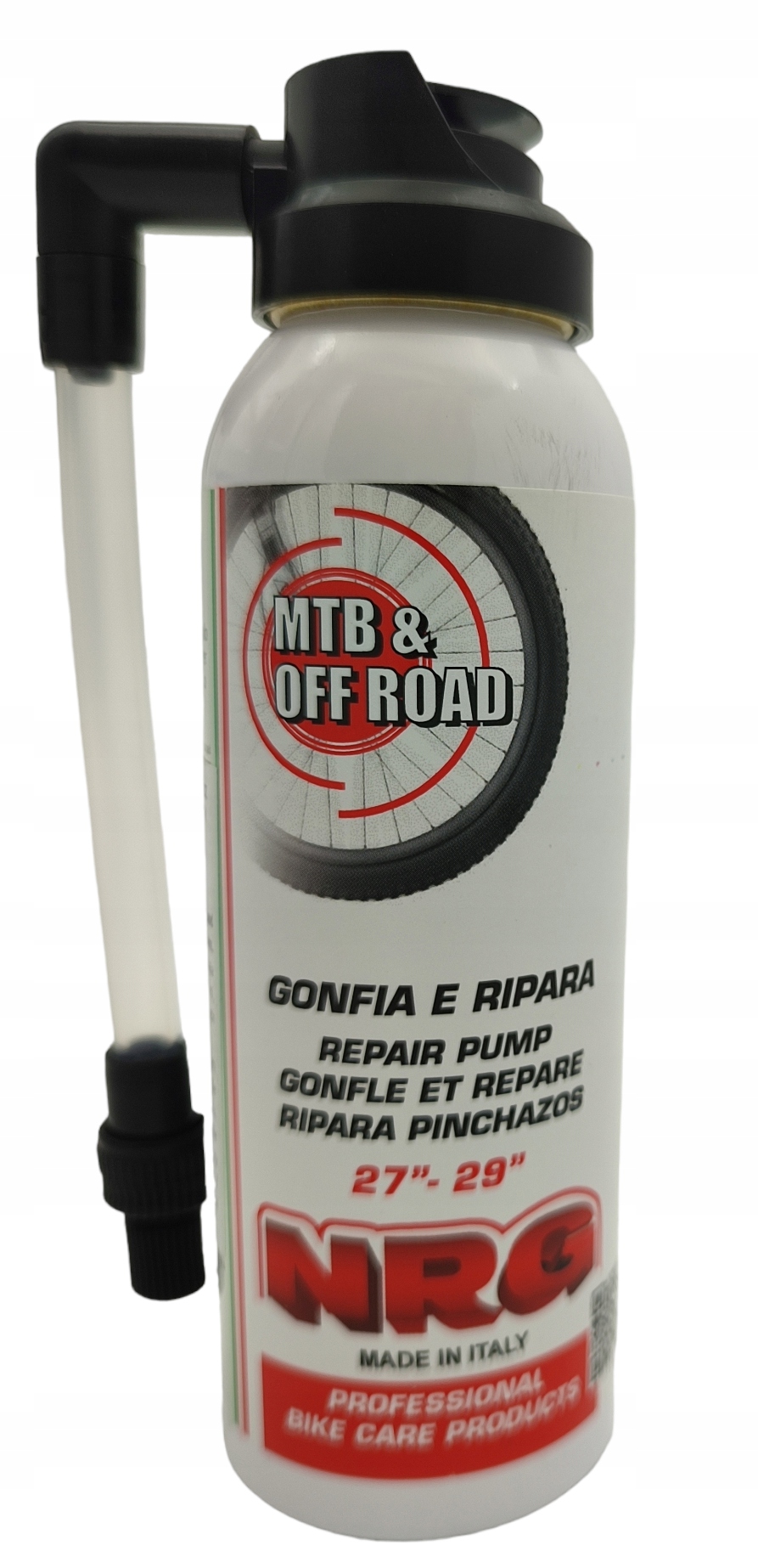 NRG MTB & OFFROAD Спрей-герметик для ремонта камер и шин горных велосипедов — чрезвычайно эффективный продукт для использования в чрезвычайных ситуациях. Мгновенно накачивает и ремонтирует все типы проколотых шин, с камерами и без.