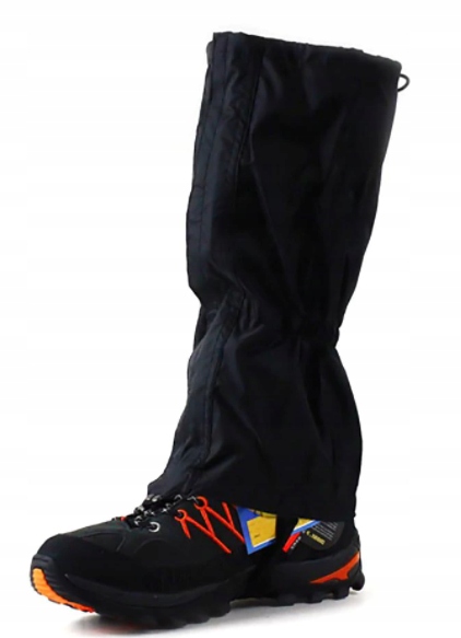 - Высокие походные бахилыиз чрезвычайно прочного пропитанного материала. Они характеризуются высокой устойчивостью к воде, снегу, грязи и ветру. Защищают ноги от намокания, а обувь от попадания снега.