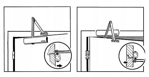 - Монтаж на створке двери со стороны противопетли. - со стороны петель, можно установить на параллельный рычаг