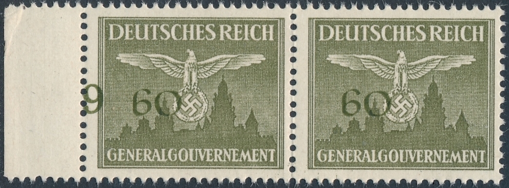марки чистые, без этикетки и следов ее, почтово чистые в горизонтальной паре с полями, У34 отсчитывают номер населенного пункта на рамке марки с большим сдвигом номинала, расположенной на замковой башне и на герб, левый штамп, сдвиг номинала на штемпеле вправо, очень редкое вредное значение в такой системе ошибок, гарантия компании Анджей Бартох PDF - Польский Филателистический Дом