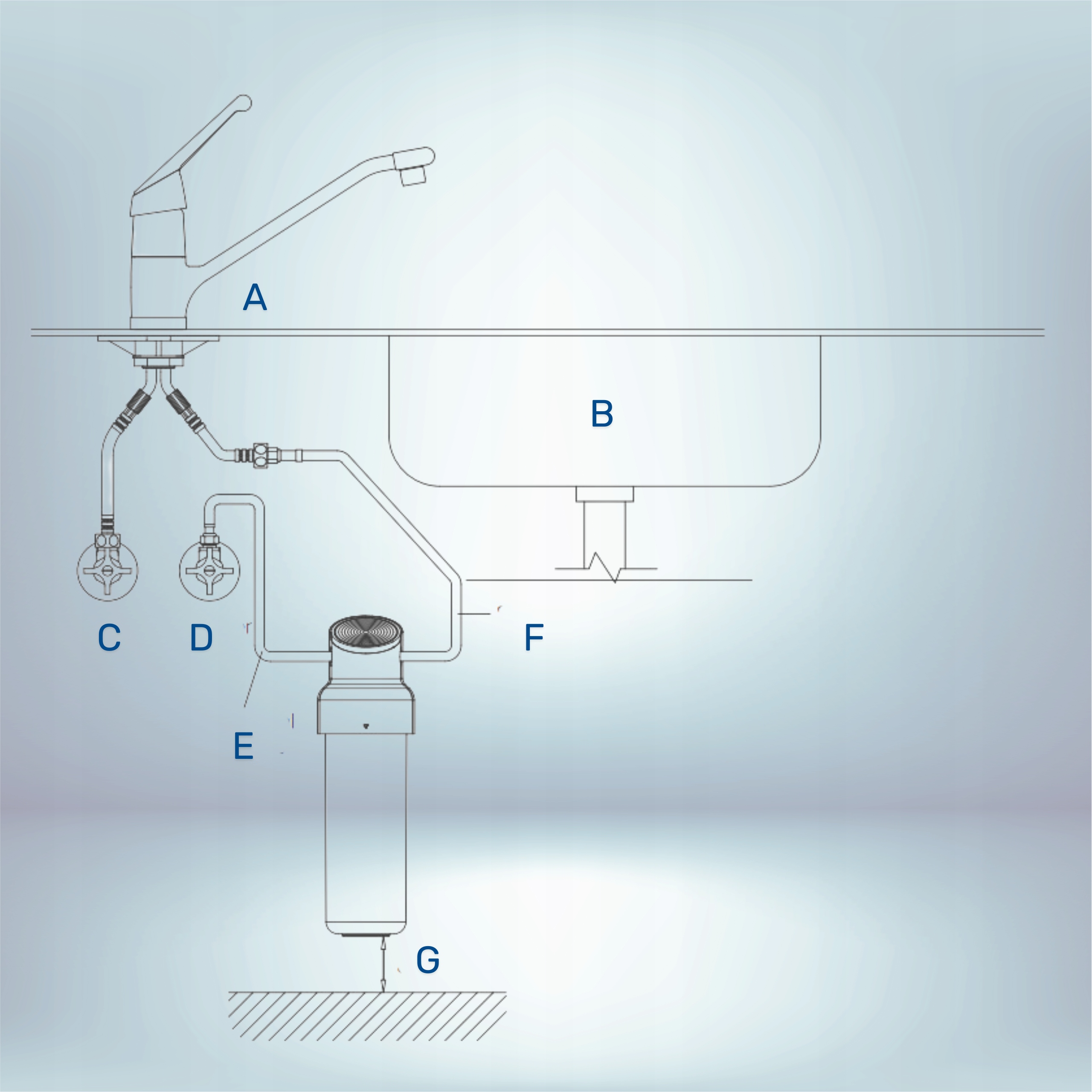 Фильтр оснащен 3/8 шлангами », которые непосредственно соответствуют стандартным клапанам . для преобразования с 3/8 "до 1/2", что позволяет устанавливать на существующую установку холодной воды с диаметрами 1/2 "и 3/8. Требуется использование инструментов. ➡ Система должна быть подключена только к источнику столешницы холодной воды.