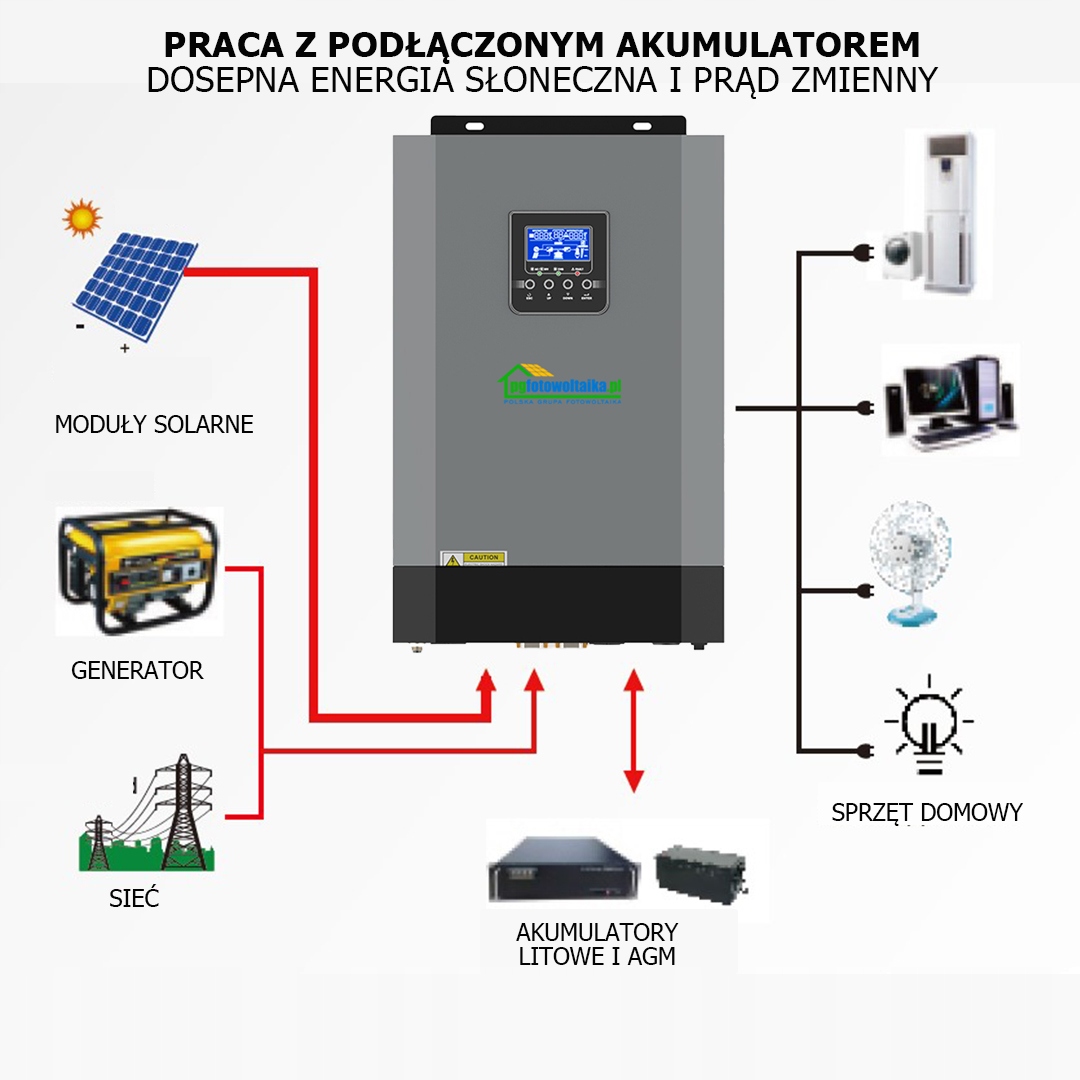 Инвертор можно подключить к сети и получать от нее энергию, когда условия для солнечных батарей недостаточны. Устройство может работать с электросетью, генератором энергии, фотоэлектрическими панелями и аккумуляторами.