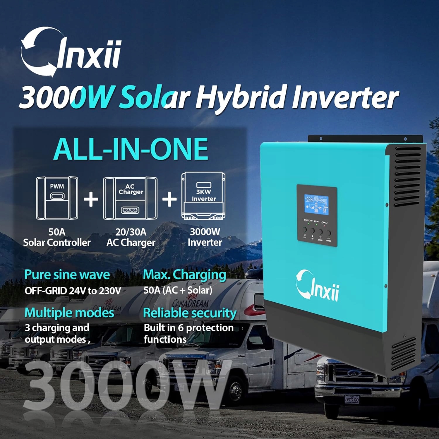 inxii 3KVA/3000W Гибрид Инвертор оснащен 4 функциями. PWM 50 Регулятор зарядки также может использоваться в качестве зарядного устройства DC AC. Он может быть настроен в качестве приоритета сети (UPS) или использовать только в качестве инвертора, подключенного к батарее.