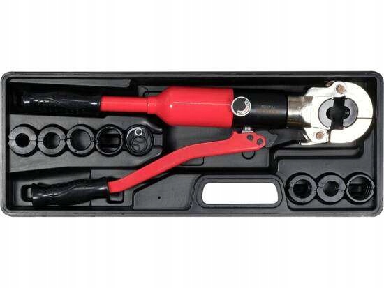Гидравлический обжимной инструмент для обжима соединителей на трубах PEX-AL-PEX, PERT-AL-PERT с набором из 8 матриц. Он оснащен гидроцилиндром, позволяющим точно и плотно затягивать разъемы с усилием давления 10Т. Вращающаяся на 360° головка позволяет работать в труднодоступных местах. Система быстрой смены матрицы позволяет легко заменять матрицу. Пресс комплектуется набором соединителей: Тип U: 16/20/25/32 мм Тип ТН: 16/20/26/32 мм Комплект помещен в пластиковый кейс.