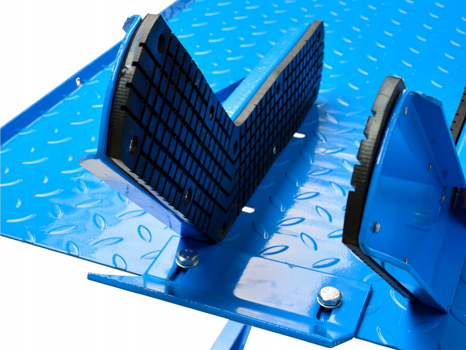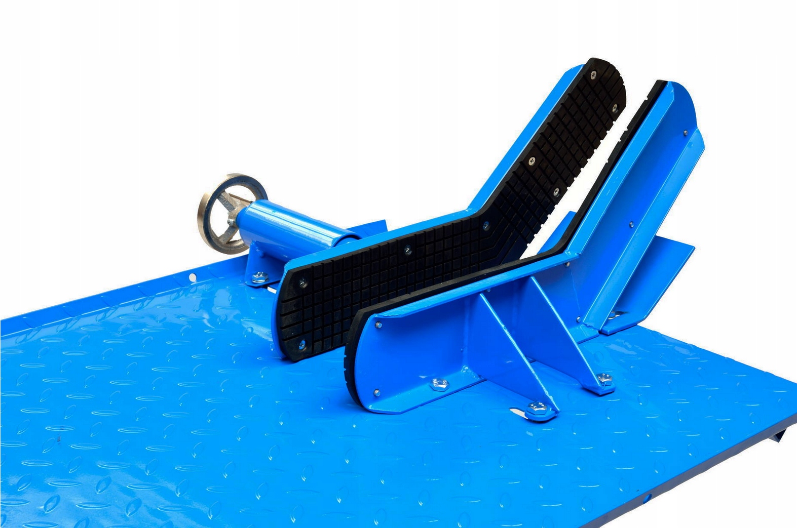 Противоскользящая конструкция рабочей поверхности и тиски, фиксирующие переднее колесо, эффективно стабилизируют положение мотоцикла на платформе.