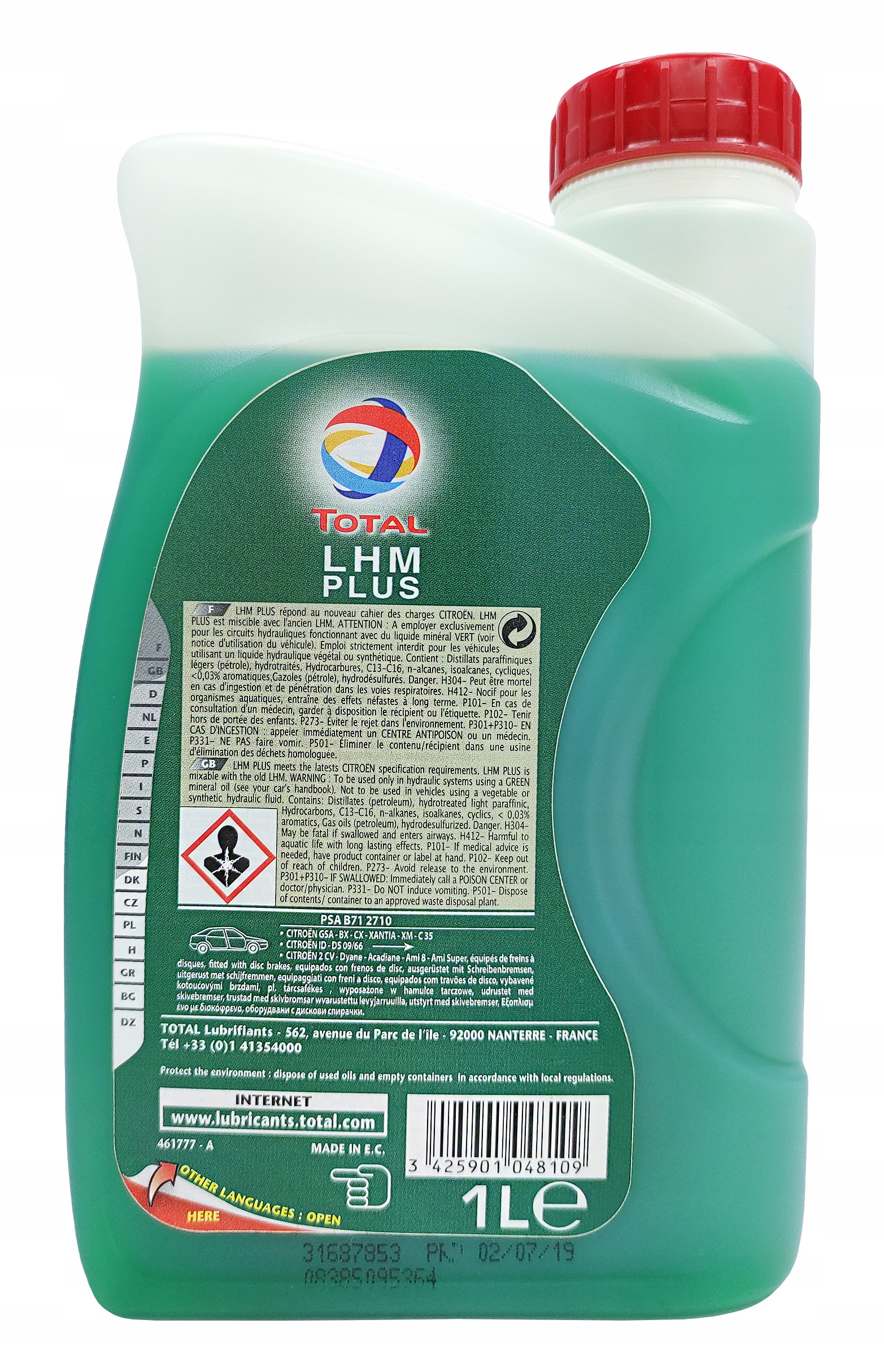 TOTAL LHM PLUS Fluid — специальная минеральная жидкость с повышенной текучестью при низких температурах. Соответствует требованиям Citroen в отношении жидкостей для гидравлических систем, гидроусилителей руля и тормозных систем, а также системы подвески.