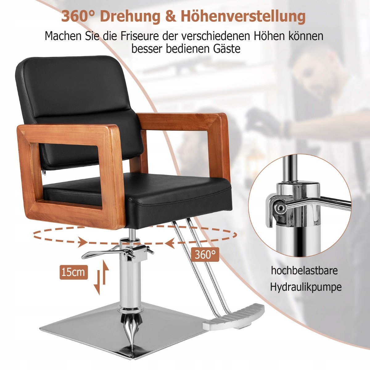 🪞 Стильный дизайн премиум-класса - блестящее, оцинкованное основание, элегантные деревянные подлокотники а стеганое сиденье создает неповторимый визуальный эффект, который порадует каждого клиента.