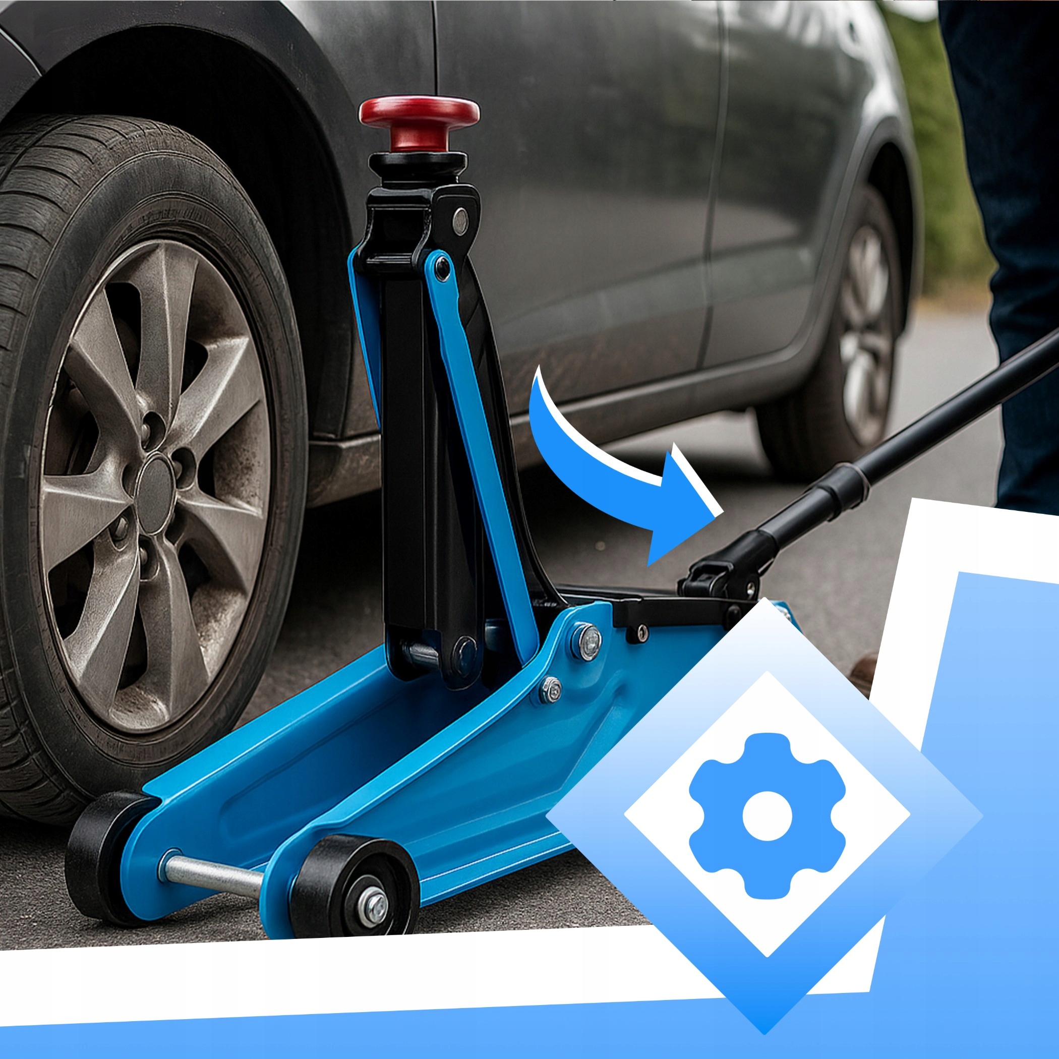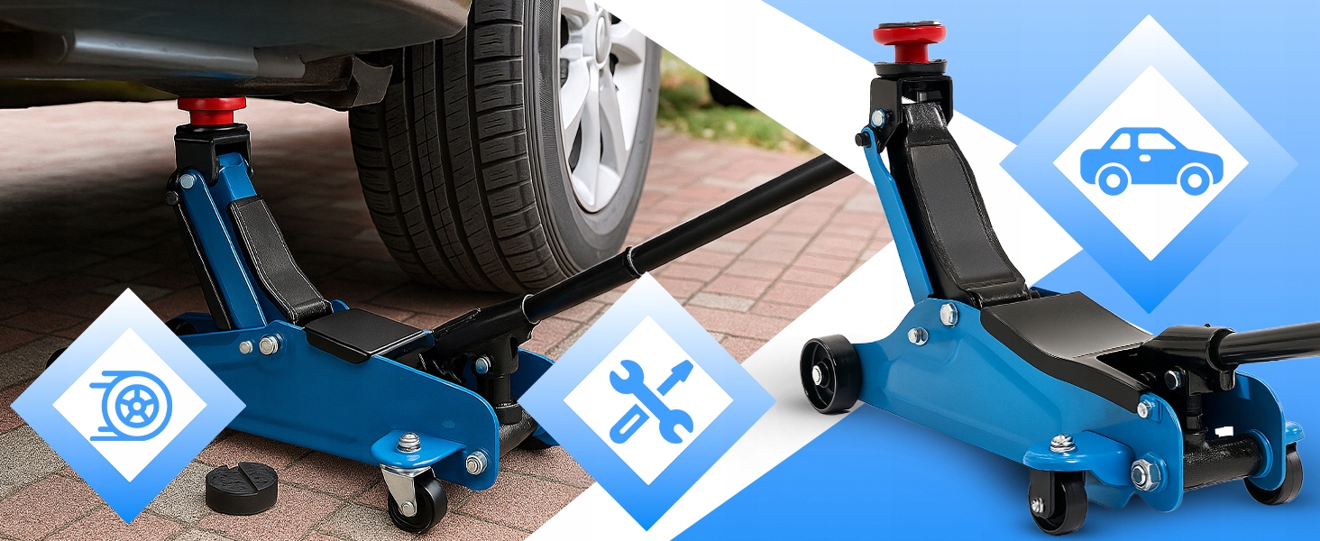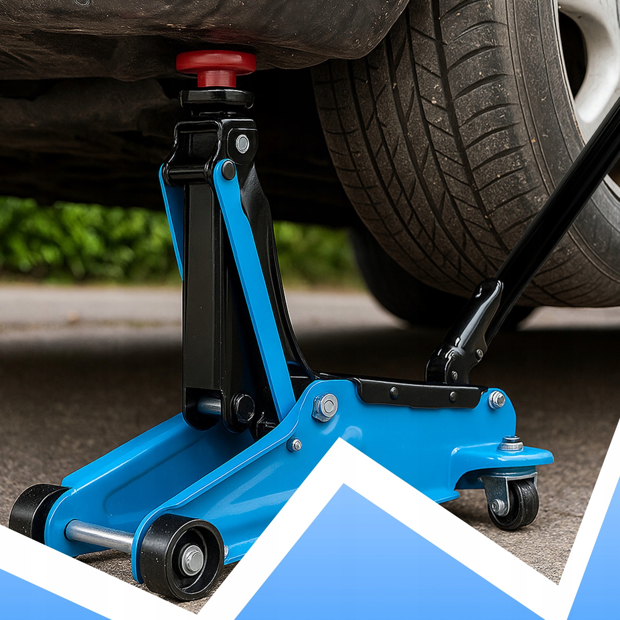 - Надежные поворотные колеса повышают мобильность, позволяя быстро расположить домкрат под автомобилем.