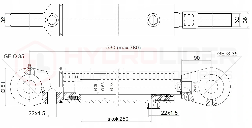 Гидравлический цилиндр цилиндр 2-St 63/36/250 Skok 250 мм L: 530 Гидролид