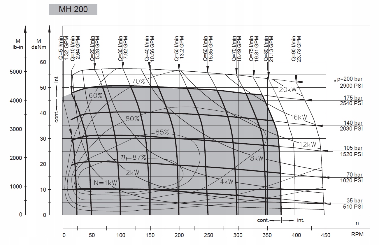 Рабочие диаграммы показывают среднюю производительность случайно выбранных двигателей при давлении 5–10 бар [72,5–145 PSI] и вязкости 32 мм²/с [150 SUS] при 50°C [122 F].