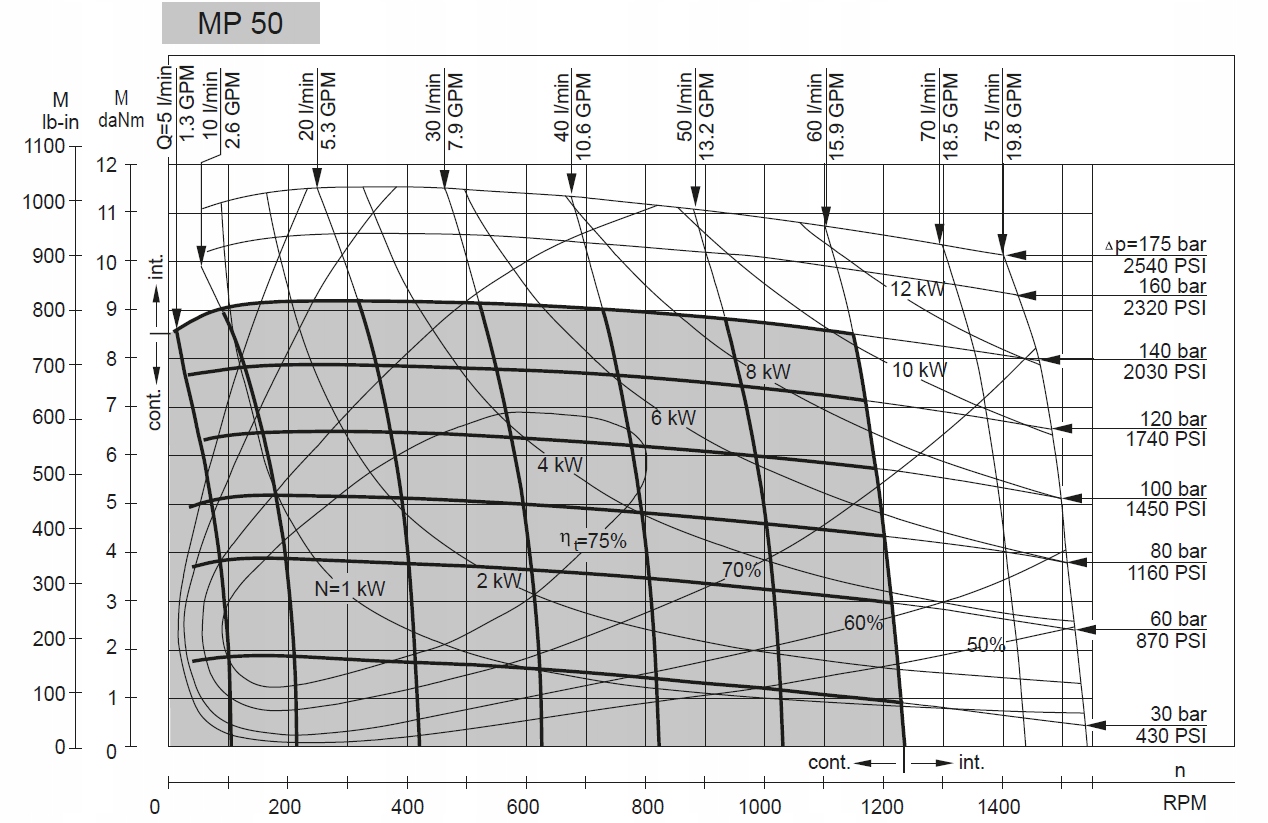 Данные диаграммы относятся к среднему КПД случайно выбранных двигателей с обратным давлением 5–10 бар [72,5–145 фунтов на квадратный дюйм] и маслом с вязкость 32 мм²/с [150 SUS] при температуре 50° C [122 F].