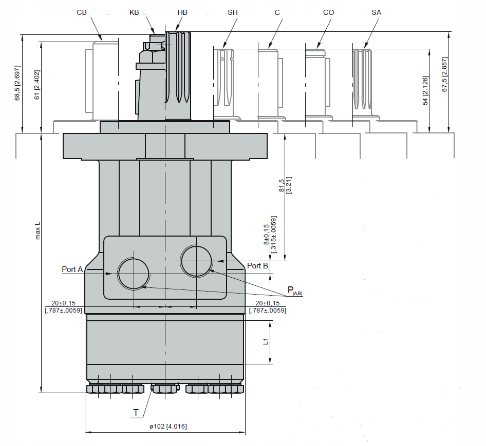 P(A,B): 2xG1/2 или 2xM22x1,5 — глубина 15 мм [0,59 дюйма].