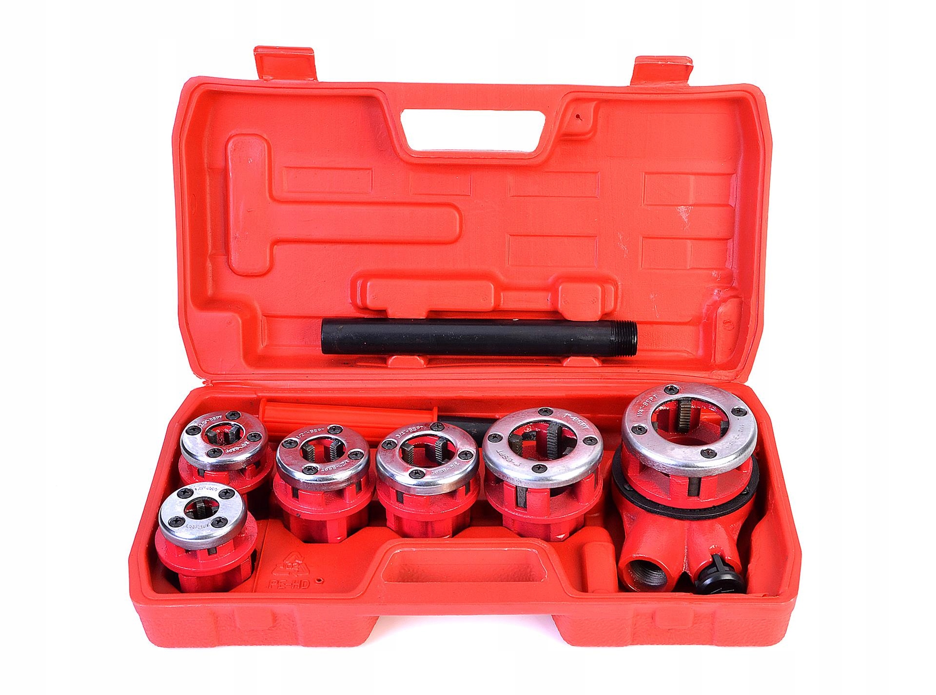 Нарезатель резьбы для труб гидравлических в комплекте с 6 плашками. Устройство используется для нарезания резьбы на трубах и фитингах. Его можно использовать как при ремонте, так и при строительстве. Зубья резьбонарезные изготовлены из легированной стали CrV с твердостью HRC в диапазоне 58-62. Чугунный корпус матрицы.