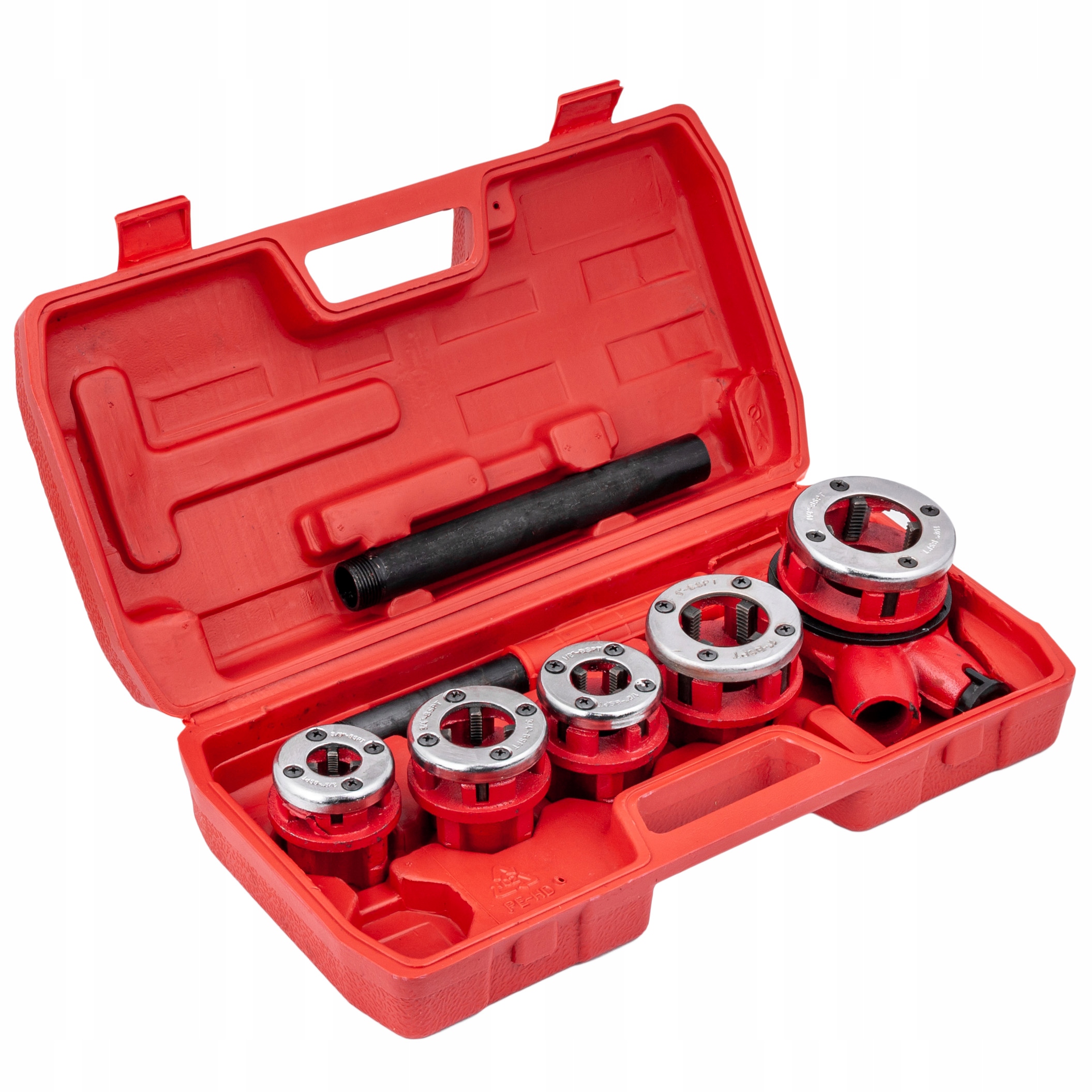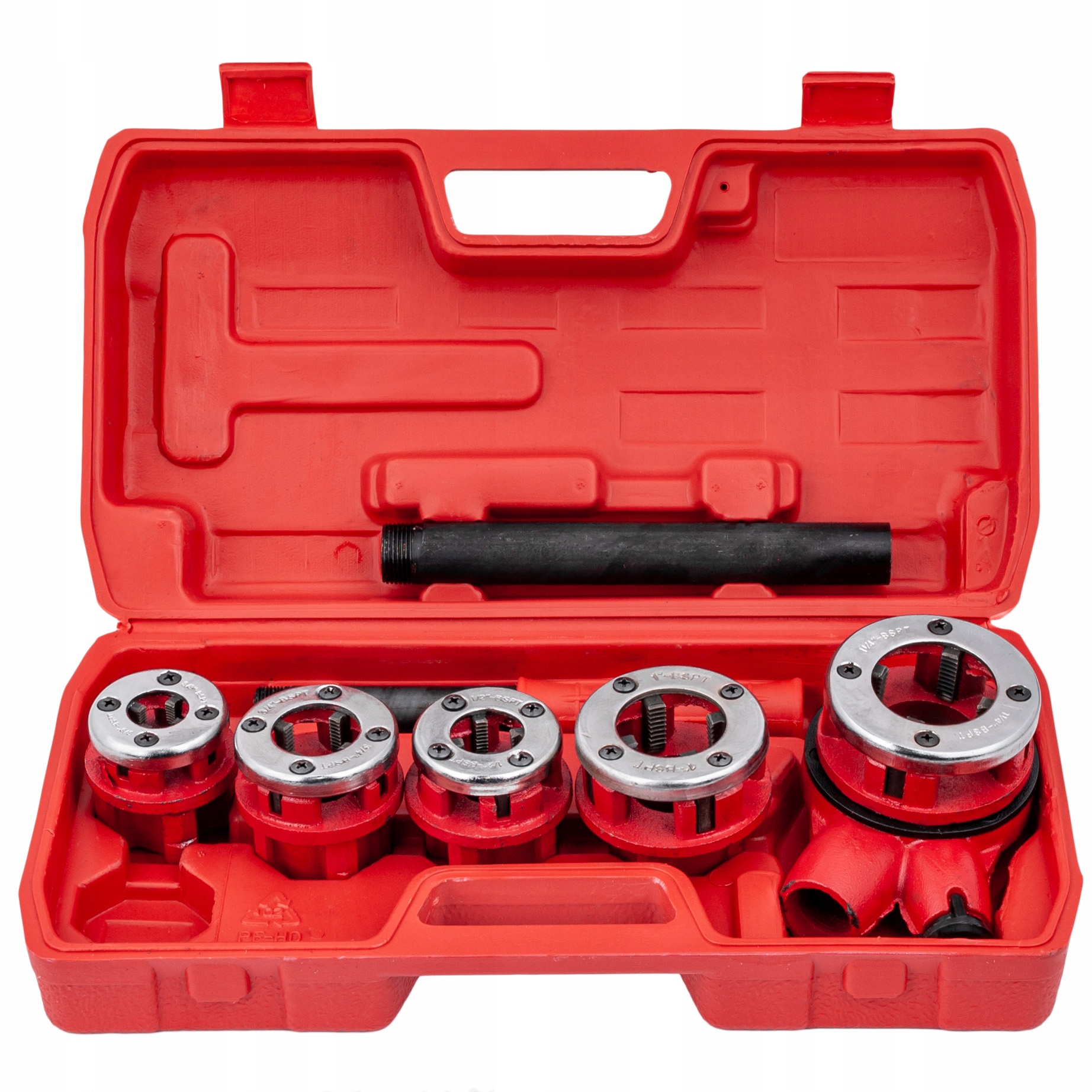 Набор поставляется в удобном футляре для удобства транспортировки и хранения. Это устройство используется для нарезания резьбы на трубах и фитингах. Его можно использовать как при ремонте, так и при строительстве. Имеется трещотка для крепления плашек. Новый, не использовался, упакован производителем.