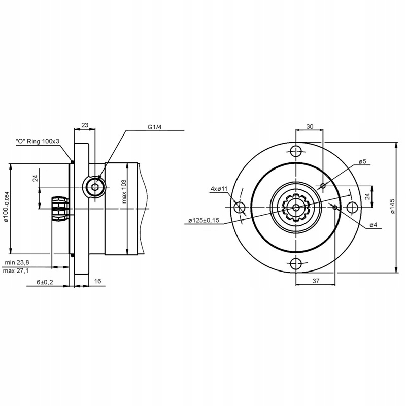 - Фланец: круглый с 4 отверстиями ø11 мм с расстоянием между ними ø125 мм, диаметр пилота ø100 мм.