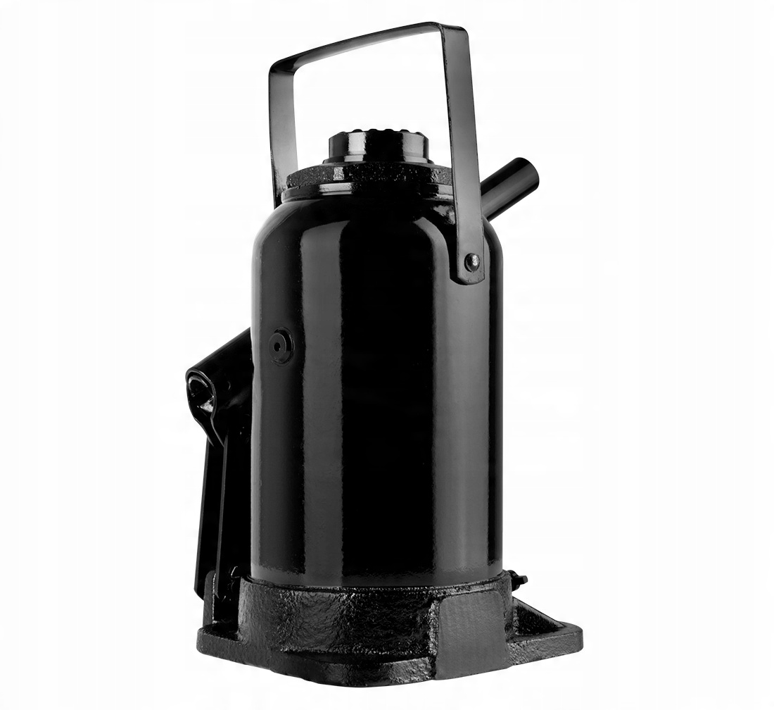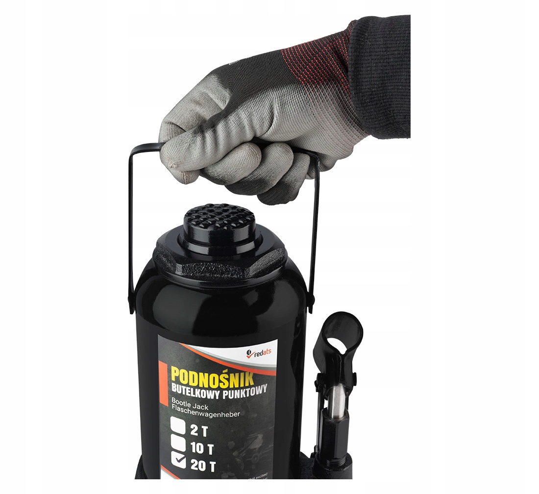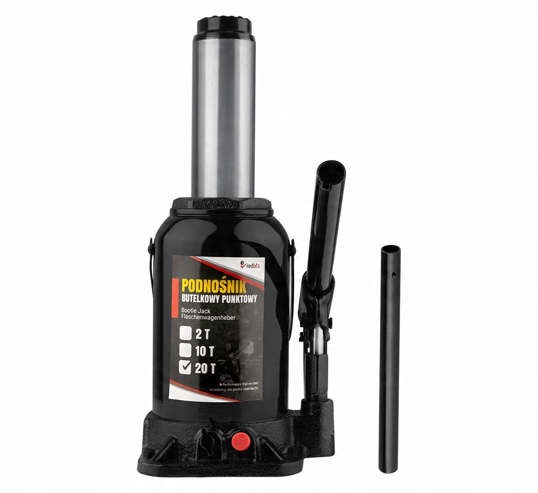 Бутылочный домкрат оснащен рукояткой, состоящей из двух частей — складной элемент значительно облегчает работу при подъеме автомобилей.