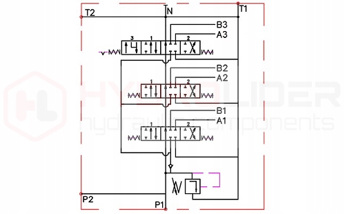 - 3-х секционный гидрораспределитель 40 л/мин с одной плавающей секцией и пружинным позиционированием.