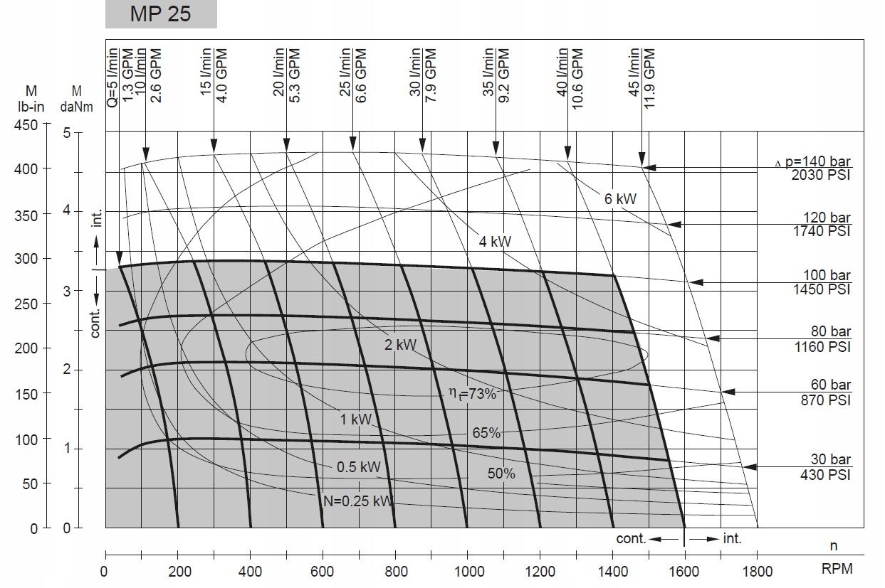 Данные диаграммы относятся к среднему КПД случайно выбранных двигателей с обратным давлением 5÷10 бар [72,5÷145 PSI] и маслом с вязкость 32 мм²/с [150 SUS] при температуре 50° C [122 F].