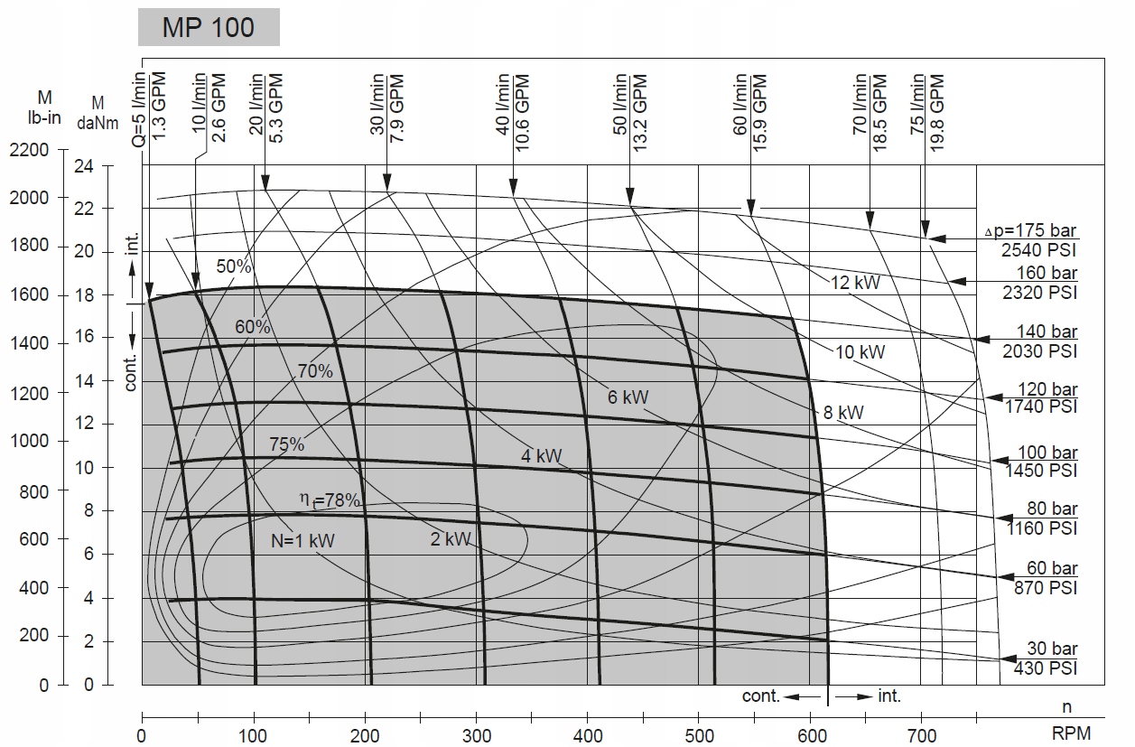 Данные диаграммы относятся к среднему КПД случайно выбранных двигателей с обратным давлением 5–10 бар [72,5–145 фунтов на квадратный дюйм] и маслом с вязкость 32 мм²/с [150 SUS] при температуре 50° C [122 F].
