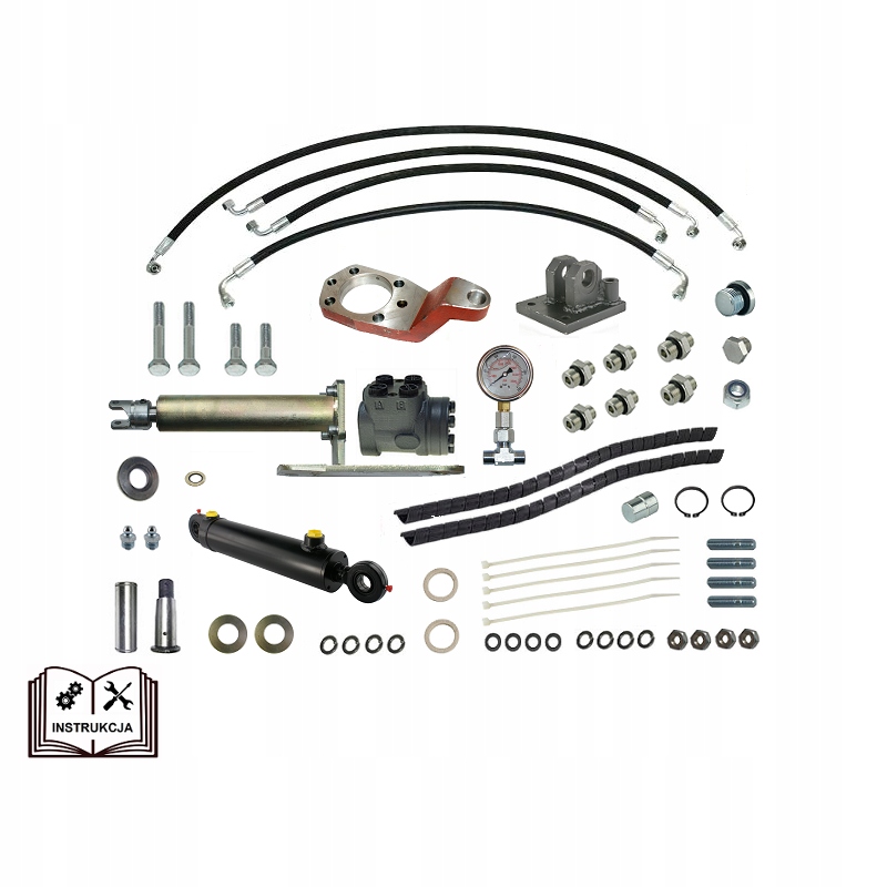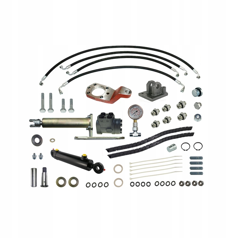 Цилиндр: Усиленный гидроцилиндр двойного действия в комплекте с головками на самовыравнивающихся подшипниках Орбитрол: Полный орбитрол с усиленным кронштейном, двухопорная рулевая колонка и вилка. Устанавливается вместо сервопривода. Поворотный рычаг привода: изготовлен из армированного ковкого чугуна. Установлен с правой стороны возле крыла на место старого рычага. Требуется замена рычага. Оригинальный рычаг хоть и аналогичен, но не обеспечивает правильную работу привода Кронштейн привода: установлен на передней оси Глицериновый манометр: входит в комплект разъема, диапазон измерения давления: 0-250 бар Комплект гидравлических линий: в целях безопасности обернуты двойной оплеткой Спиральные крышки: защищают магистрали от повреждений Стандарты: необходимы для правильной установки привода поддержка по трактору БЕСПЛАТНАЯ сервисная книжка: