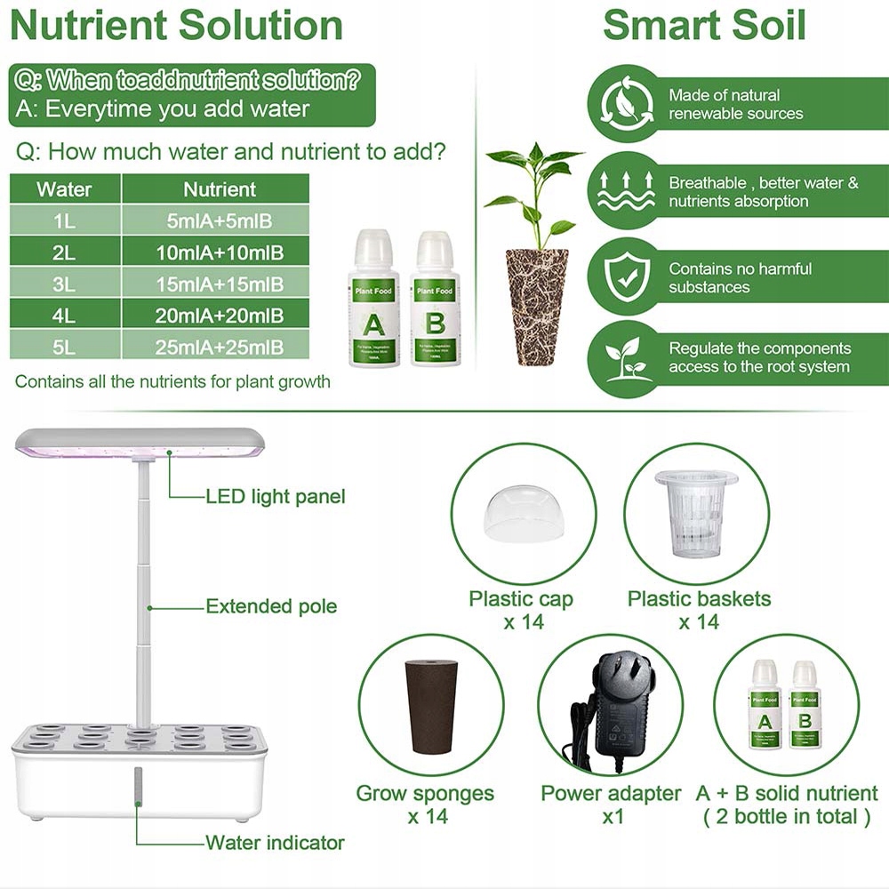 - [БАК ДЛЯ ВОДЫ БОЛЬШОЙ ЕМКОСТИ 5 Л] - В комплект входит 5-литровый резервуар для воды, абажур. , регулируемый столб, источник питания, 14 корзин, 14 губок, твердые питательные вещества, одновременно поддерживает 14 растений, обеспечивает высокую урожайность в вашем доме.
