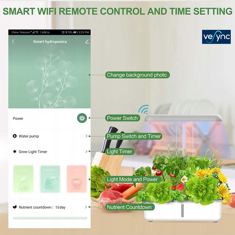 - [Совместимость с Wi-Fi] - Умная гидропонная система выращивания, интеллектуальный пульт дистанционного управления Wi-Fi и настройка времени. Независимо от ограничений в поездках и на открытом воздухе, вы можете контролировать рост фруктов и овощей в любом месте и в любое время в течение года.