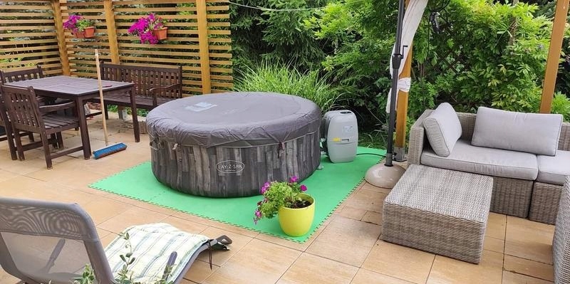 Расслабьтесь и помассируйте себя теплой бурлящей водой в собственном саду. Джакузи, рассчитанное на четырех человек, быстрое и простое в использовании. Благодаря рисунку досок на внешней стенке она прекрасно вписывается в садовое пространство, а дно с мозаичным принтом добавляет ванне эстетическую ценность.