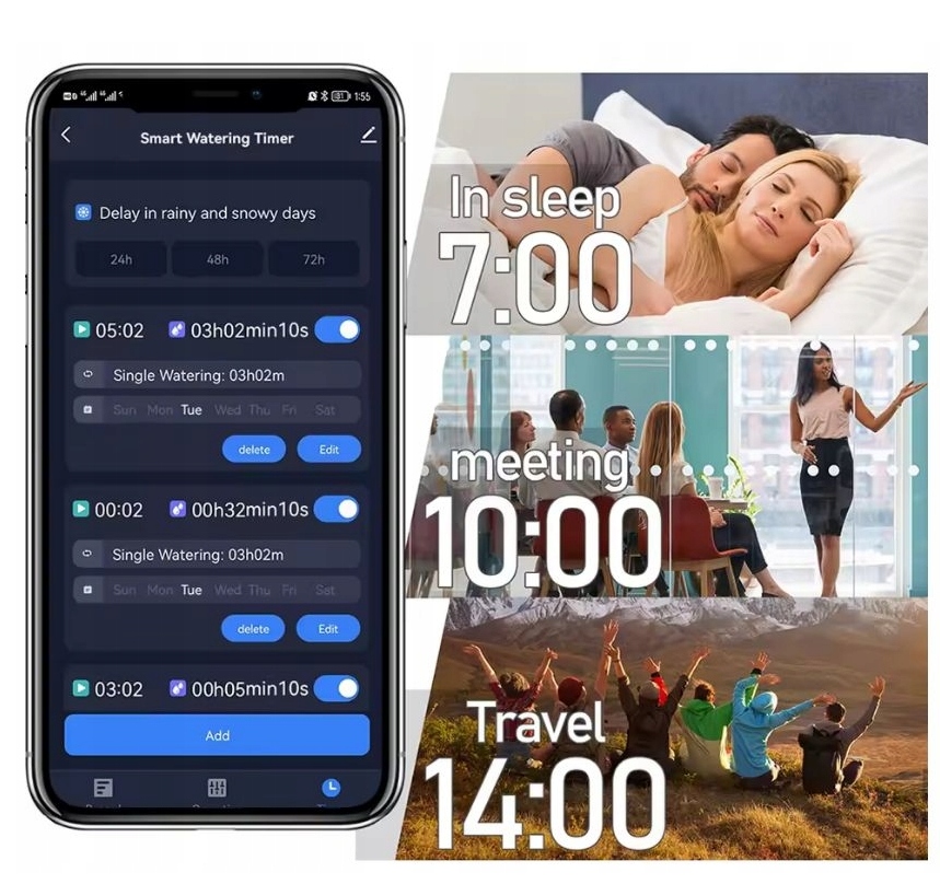 - Индивидуальное расписание и точное время настройки времени: настройка до 10 отдельных графиков полива, включая ультра -шорт -циклы ирригации всего за 1 секунду - идеально подходит для капель и чувствительных растений для воды. Отрегулируйте уход за садом каждую секунду.