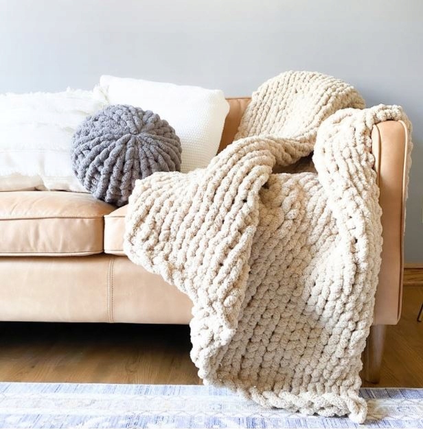 Пряжа шенилл — очень легкая и толстая пряжа для плетеного одеяла. Вес пледа размером 75х130 см составляет всего 1,25 кг.