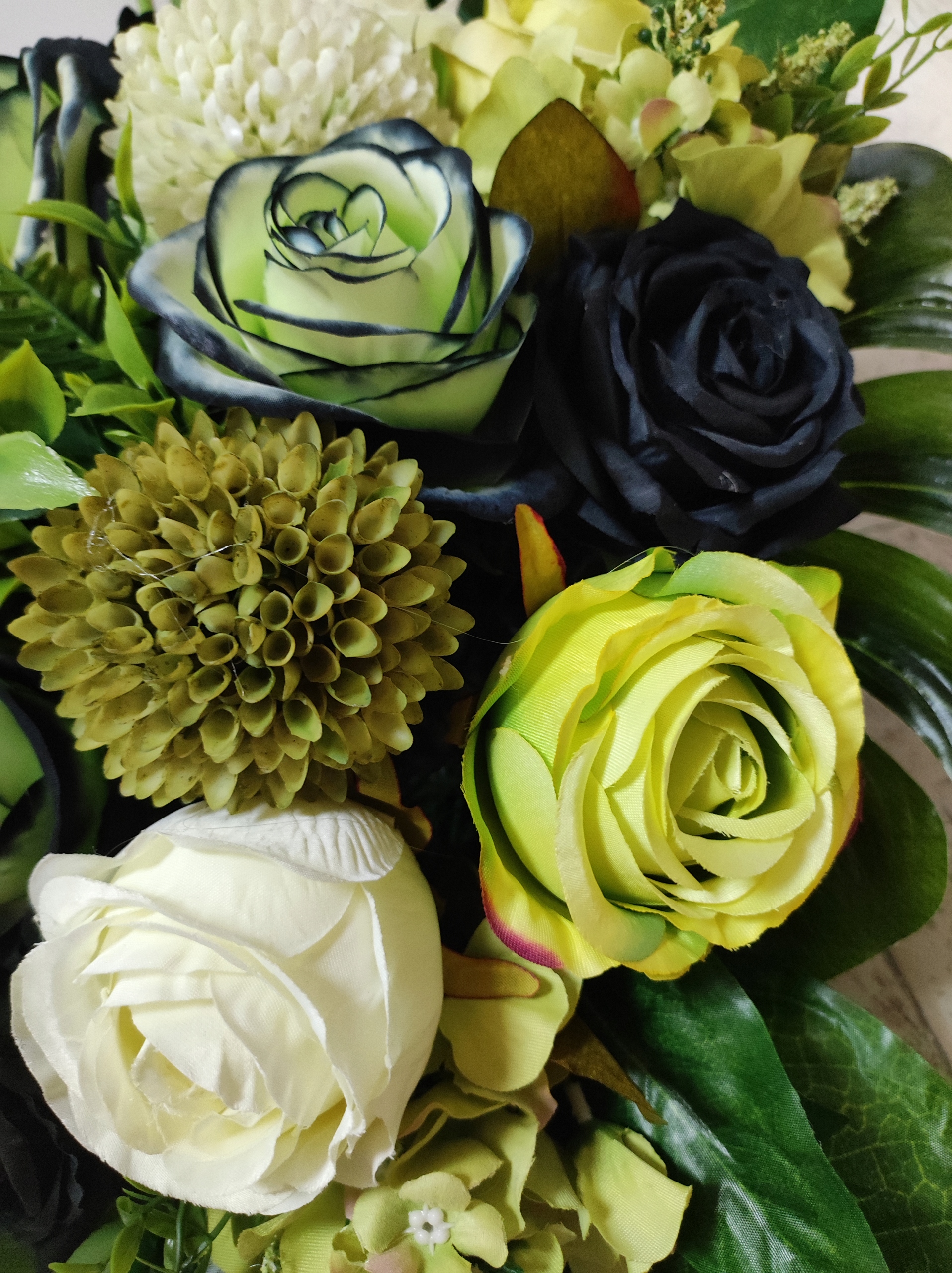 Цветы качественные, работаем с ними много лет. Композиции утяжелены, что делает их устойчивыми на могиле. Размер и цвет могут незначительно отличаться в зависимости от того, как мы организуем украшение, и настроек вашего монитора.