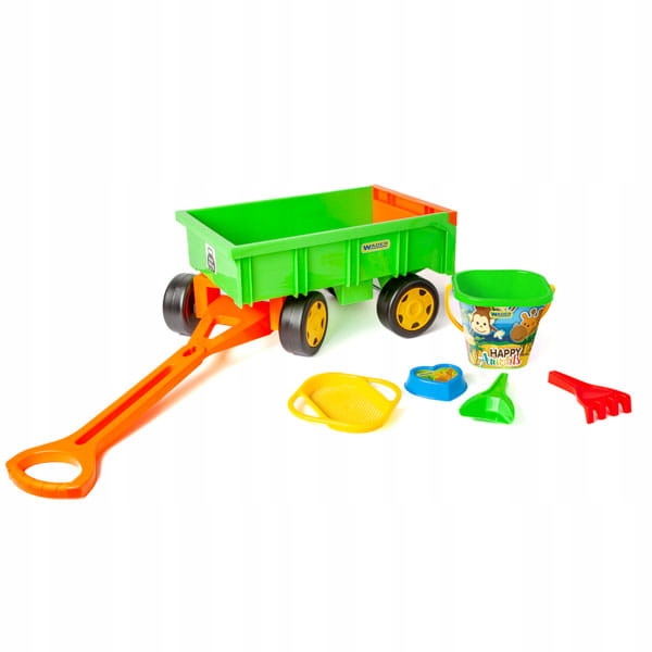 Столлер - трейлер с набором для песка - безопасная и прочная тележка с грузоподъемностью до 60 кг . Это дает много возможностей творческого развлечения - в качестве трейлера для гигантского трактора - бульдозер и Грузовик - Tipper или в качестве независимой коляски для тяги (специальная ручка сопровождается набором). Трейлер имеет открывающуюся заднюю дверь. Игрушка сопровождается летним оборудованием наших малышей - лопаточником, Grabki, плесенью, ситом и ведром с интересной графикой, сделанной с использованием метода IML. Благодаря этому это будет противостоять контакту с водой и солнцем.