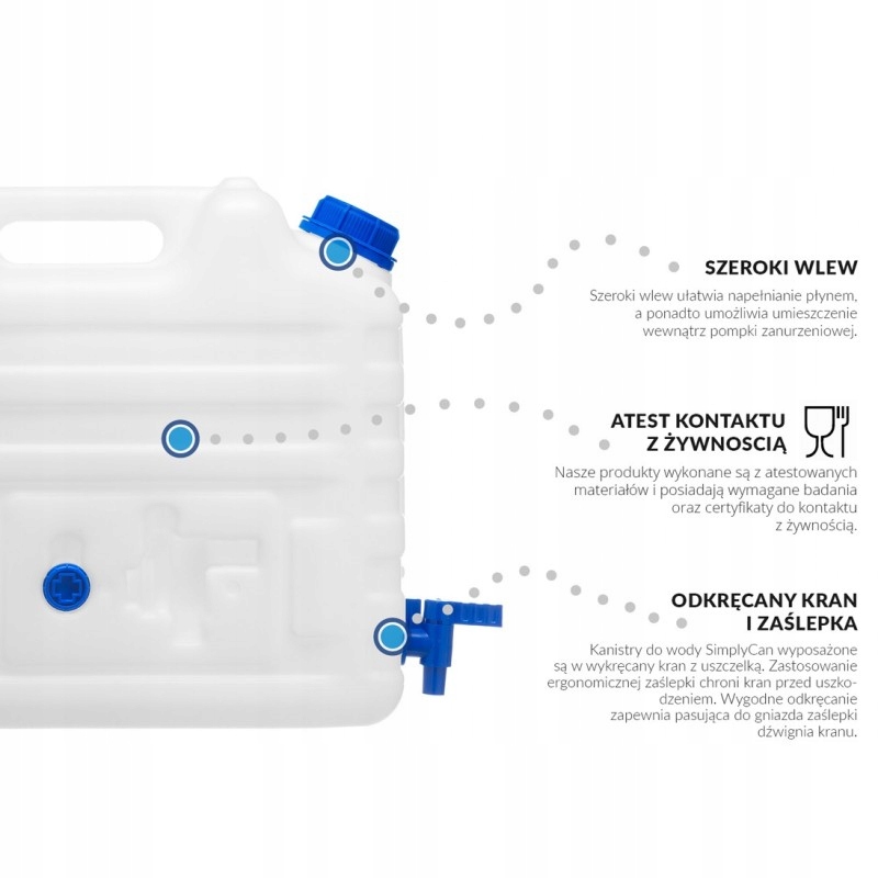 Канистры для воды SimplyCan оснащены съемным краном с уплотнителем. Использование эргономичной крышки защищает кран от повреждений. Удобное откручивание обеспечивает рычаг крана, который подходит к штепсельной розетке.