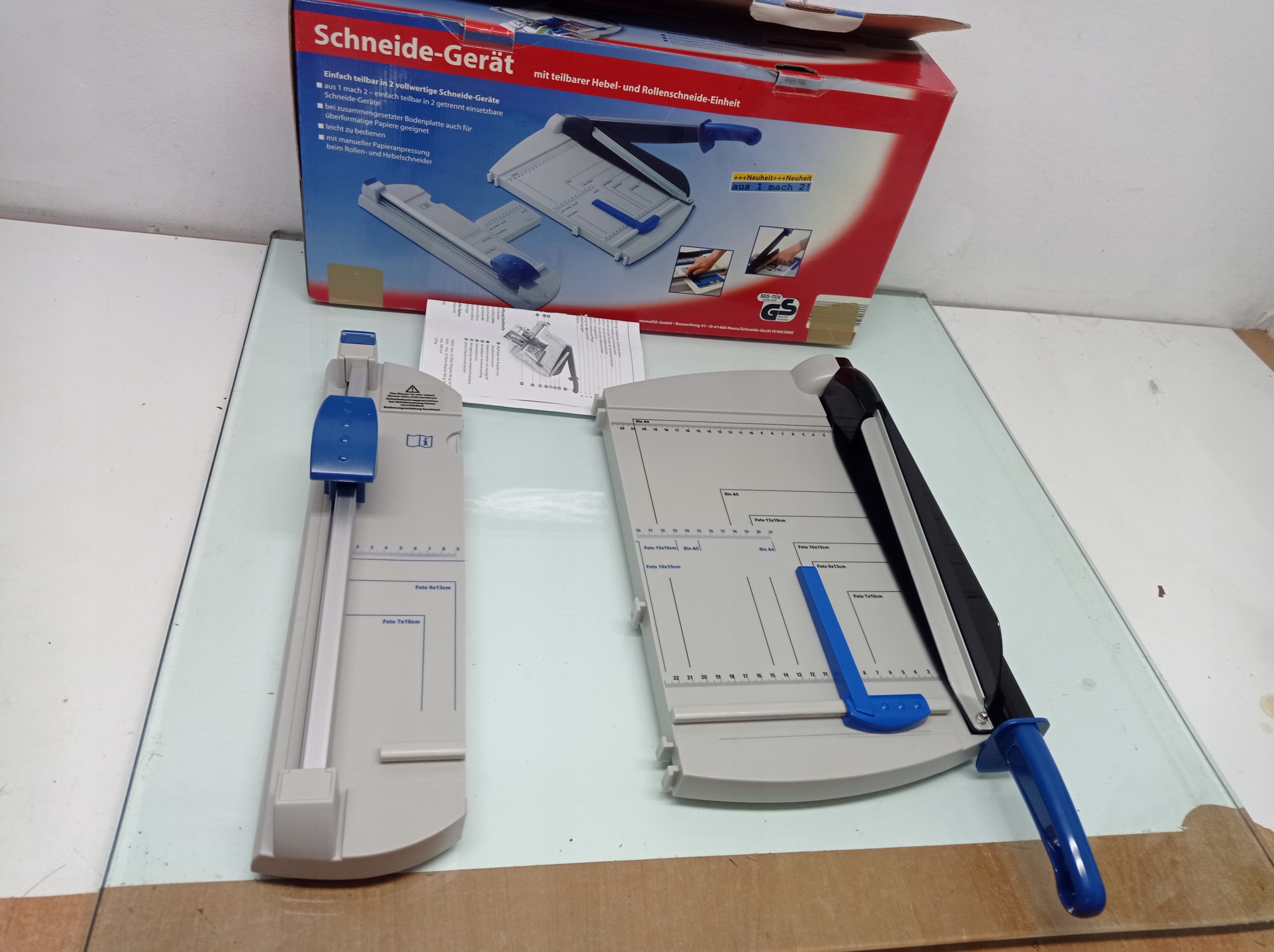 Ручная гильотина с триммером представляет собой устройство, предлагающее систему двойной резки. С его помощью мы можем точно разрезать листы А4 любого размера. Устройство не занимает много места за счет объединения двух устройств в одно. Дополнительно у нас есть возможность сложить или отсоединить триммер от гильотины. Очень удобное и точное устройство для резки листовок, визиток и фотографий. Благодаря резиновым ножкам гильотина не скользит по столешнице.