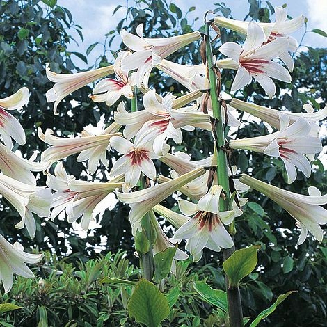 Лилия гималайская — луковичное растение с прямостоячим и прямостоячим ростом. Вырастает до 4 м в высоту, но в нашей стране около 2 м. Побег жесткий и пустой внутри. Темно-зеленые сердцевидные листья могут достигать до 40 см в длину. Период цветения гималайской лилии чаще всего приходится на июнь-август, в зависимости от погодных условий. Цветки очень красивые, кремово-белые, внутри красные, воронковидные, с широкой кроной, довольно крупные, собраны в внушительные соцветия-кисти (на одном растении может быть до 20 соцветий!), вечером испускают довольно сильный аромат. сильный, но приятный аромат. Гималайская лилия лучше всего чувствует себя на солнечном или полутенистом месте. Почва должна быть умеренно плодородной, хорошо дренированной и слегка кислой. Гималайская лилия может перезимовать в земле, но ее желательно на зиму укрыть – это точно исключит риск повреждения морозом. Он идеально подходит для больших садов, где у него много свободы для роста. Подходит для срезанных цветов. В упаковке 5 семян.