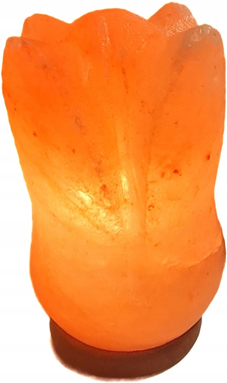 Соляная лампа интересной формы, напоминающая цветок тюльпана, вырезанная из гималайской соли.