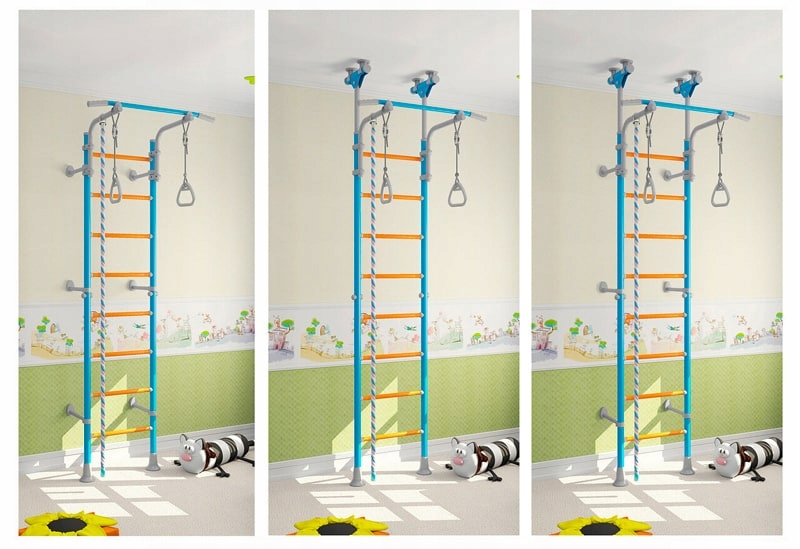 Лестница Family имеет 2 варианта сборки. Лестница для упражнений имеет перекладину, смонтированную независимо от всей конструкции лестницы и может быть размещена на любой высоте лестницы, а также входящие в комплект гимнастические принадлежности: кольца и скакалку.