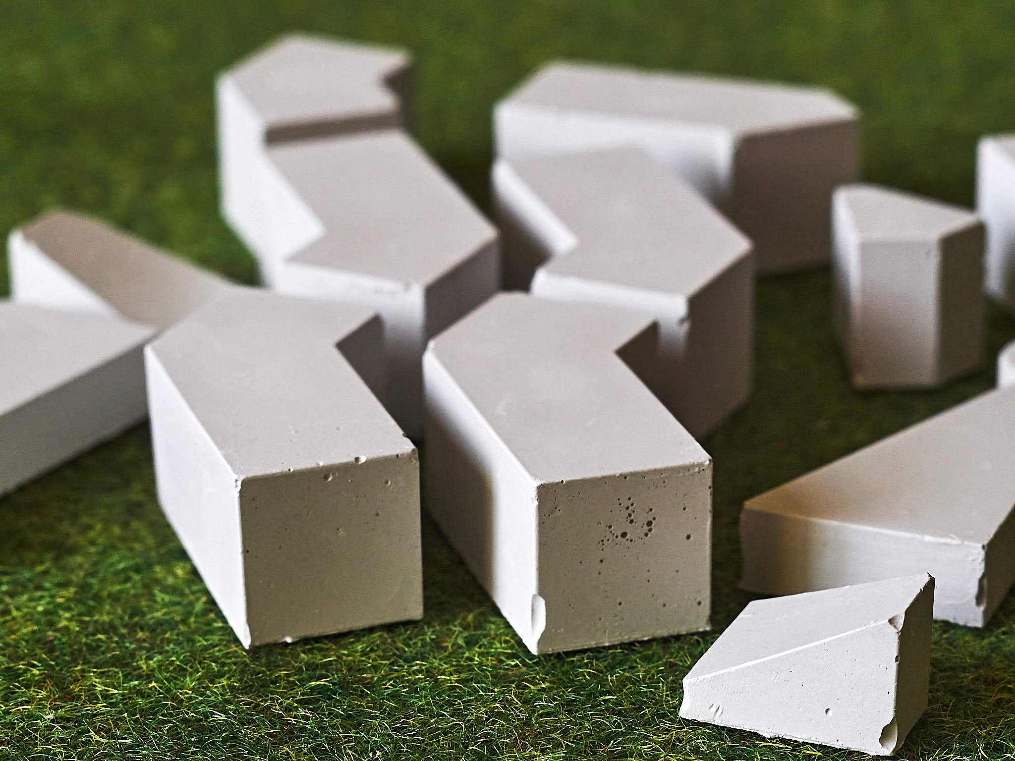 Цельные кирпичи, расположенные в форме восьмиугольника, образуют башню размером 10х10 см. Каждый слепок содержит по 2 элемента, позволяющих создать винтовую лестницу внутри башни.