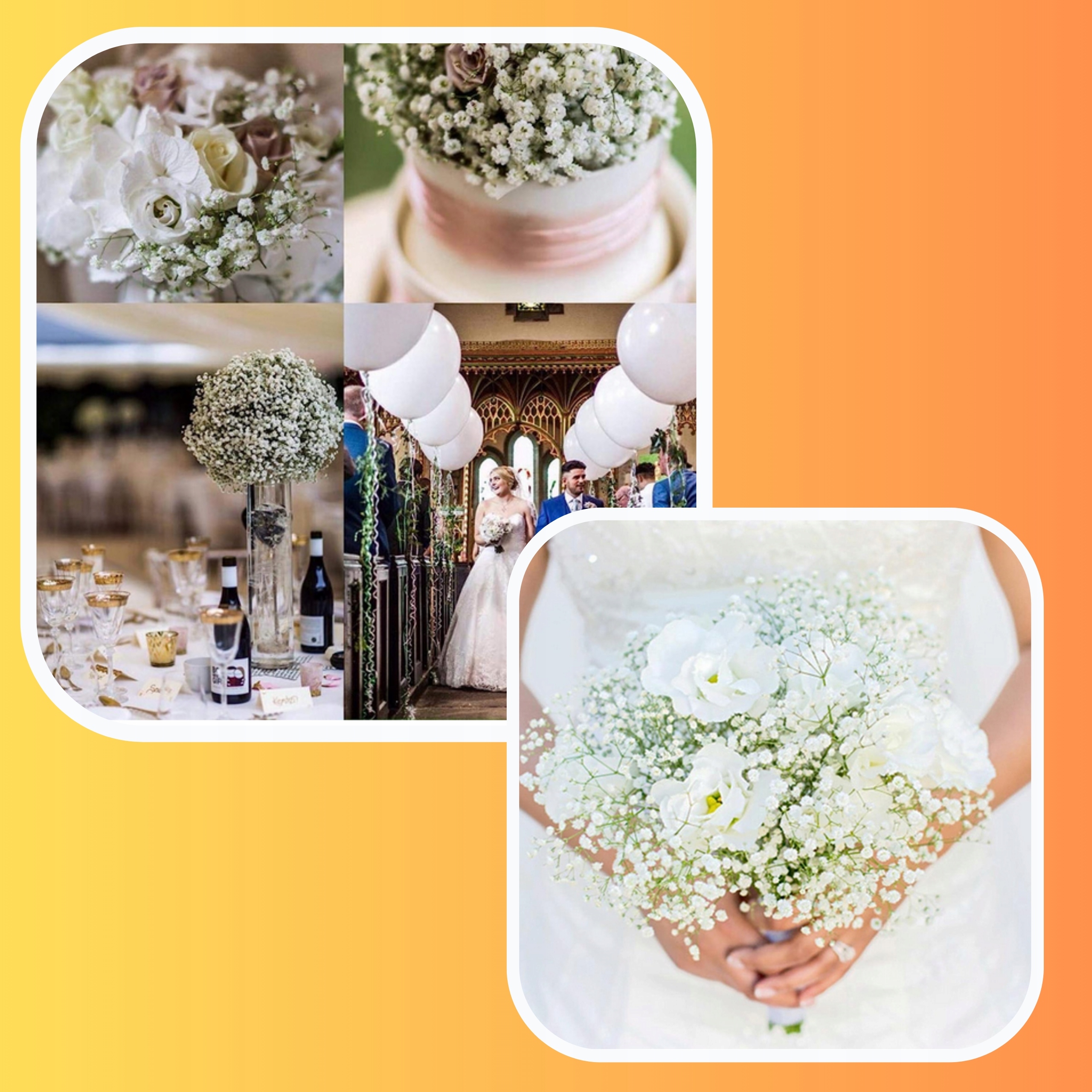 ⭐Гипсофила — разновидность искусственного цветка из гипса или других материалов, имитирующих внешний вид цветов. Это популярный декоративный элемент, используемый в различных случаях, в том числе на свадьбах.