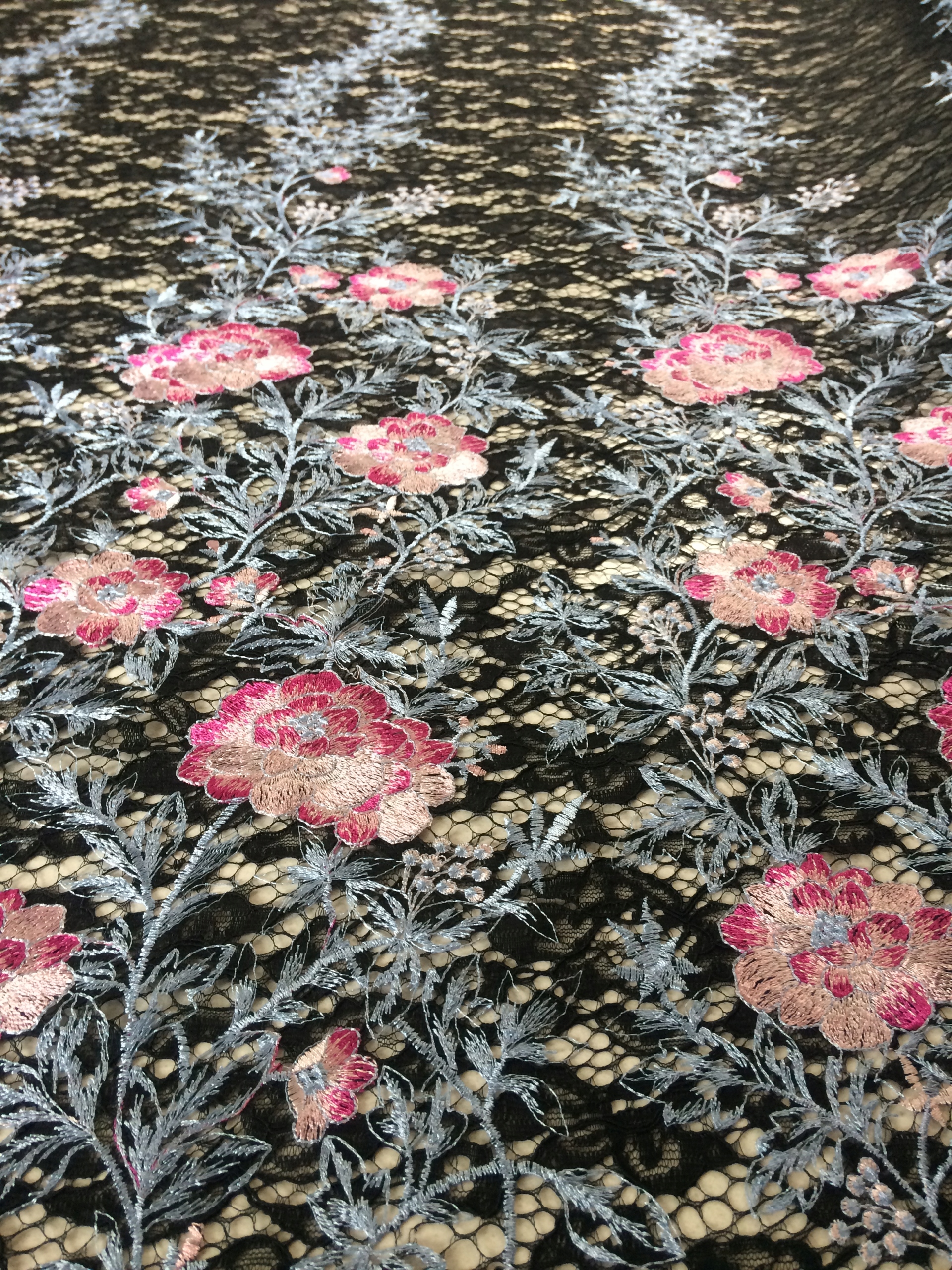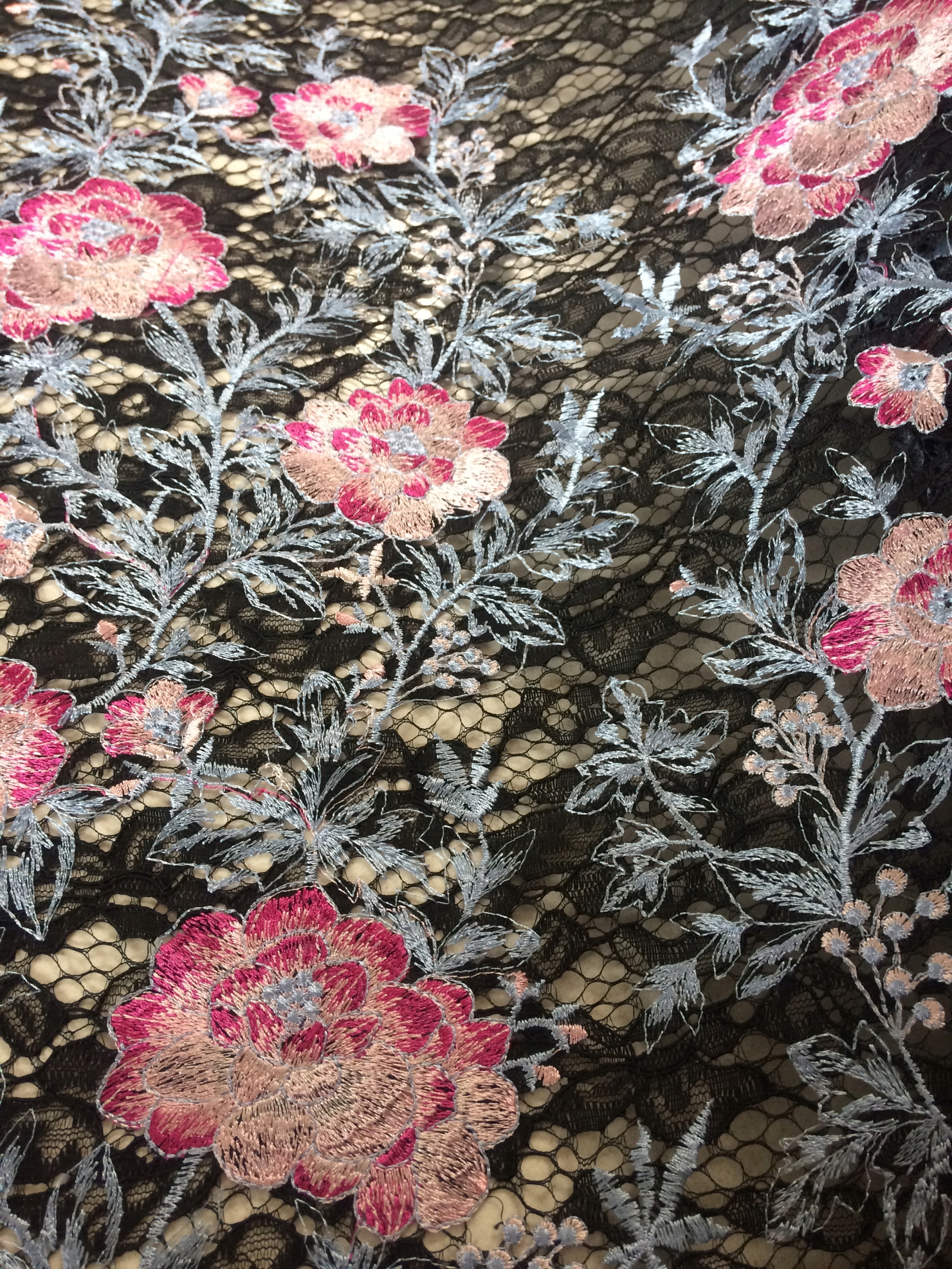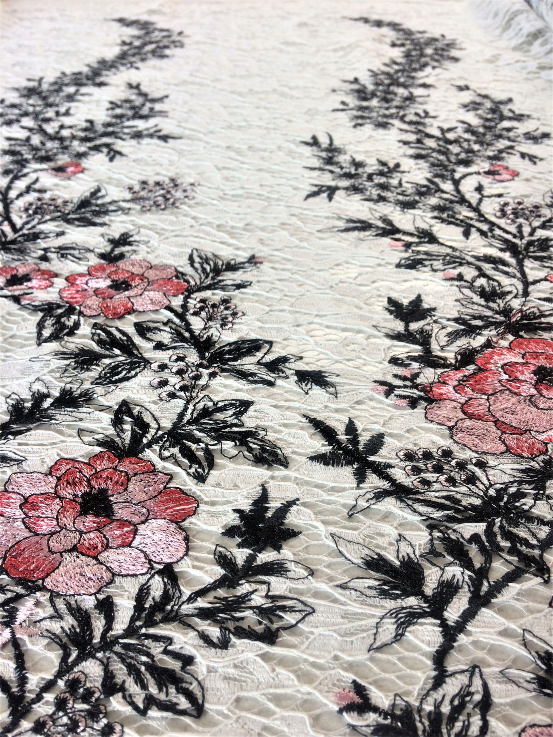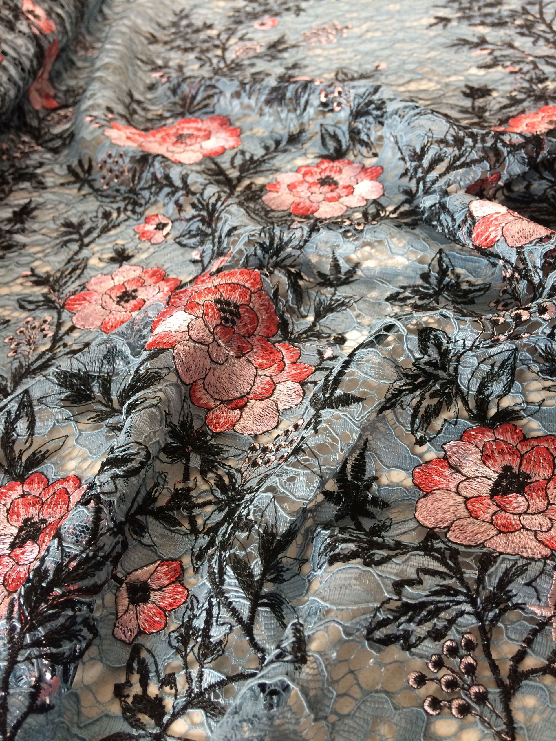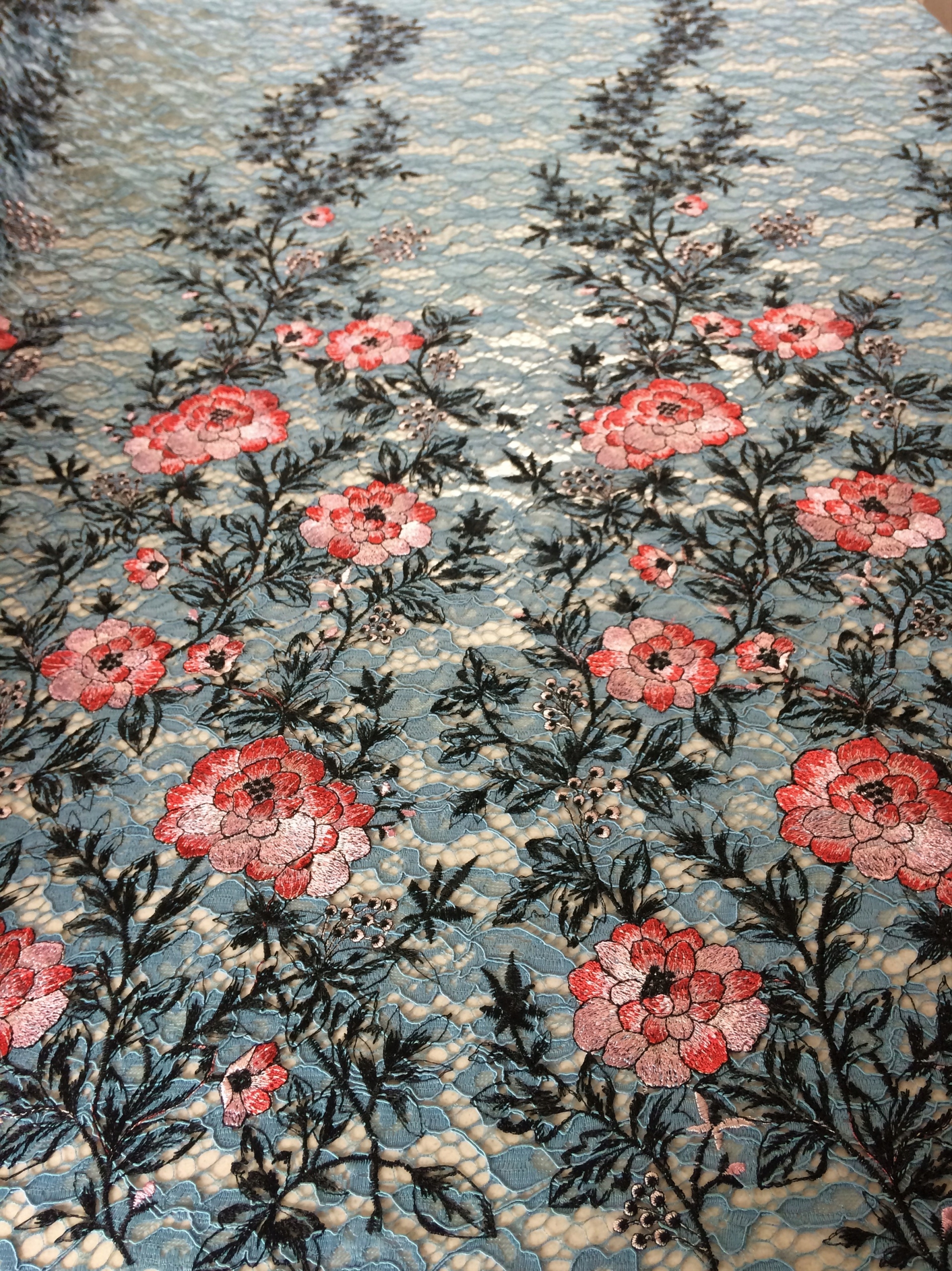 Кружево, вышивка синего, абрикосового черно-белого цвета. Аппликация-цветок вышивается по ширине ткани через равные промежутки. Кружево прозрачное, используется для длинных платьев, юбок, блузок, а также аппликаций, аксессуаров и декоративных вставок.