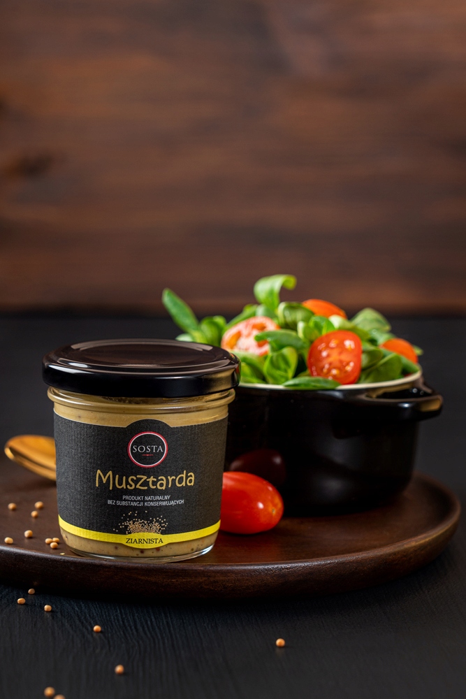 Горчица зернистая SOSTA (с цельными зернами горчицы), в состав которой входят только натуральные ингредиенты: горчица, вода, натуральный мед, яблочный уксус, соль и специи. От других горчиц ее отличает хорошо заметные семена горчицы, которые придают ей неповторимый характер и пикантный вкус.