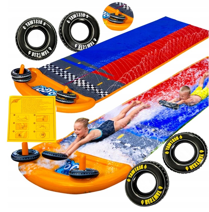 Горка для двух человек обеспечит классическое, вечное развлечение во дворе для всех детей старше 3 лет. Это будет идеальный способ провести свободное время и интересное развлечение. Просто разверните горку, прикрепите ее к земле и подсоедините садовый шланг. Благодаря специальной защите, входящей в комплект, слайд не сдвинется с места. Четыре колеса, входящие в комплект, подарят детям дополнительное развлечение и соревнование. В гонке выигрывает тот, кто первым доберется до финиша и сумеет бросить все круги на соответствующую подставку.