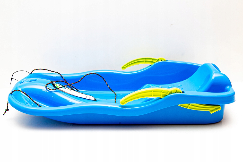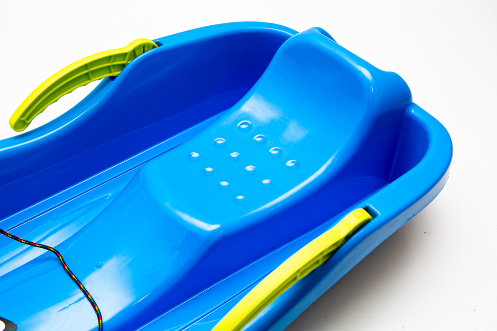 Глубокие пластиковые сани с тормозными и рулевыми рычагами и веревка для перетягивания.