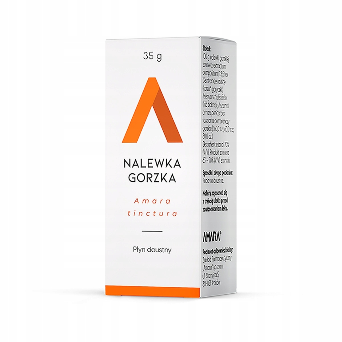 Композиция 100 г горькой настойки включает в себя: Extractum Compositum (1: 3,5) ex gendianae radix (горький корень), Menyanthidis folio (лист Бобрка), Aurantia amari amari Pericarpium (горький оранжевый плод) (60,0 части; 60,0 часть; 50,0 часть). Этанол 70 % экстракция (об./Об.) Продукт содержит 63-70 % (об./Об.) Этанол. Продюсер Фармацевтический Заклад "Амара" Sp. Z O.O. Адрес производителя Ответственная сущность: