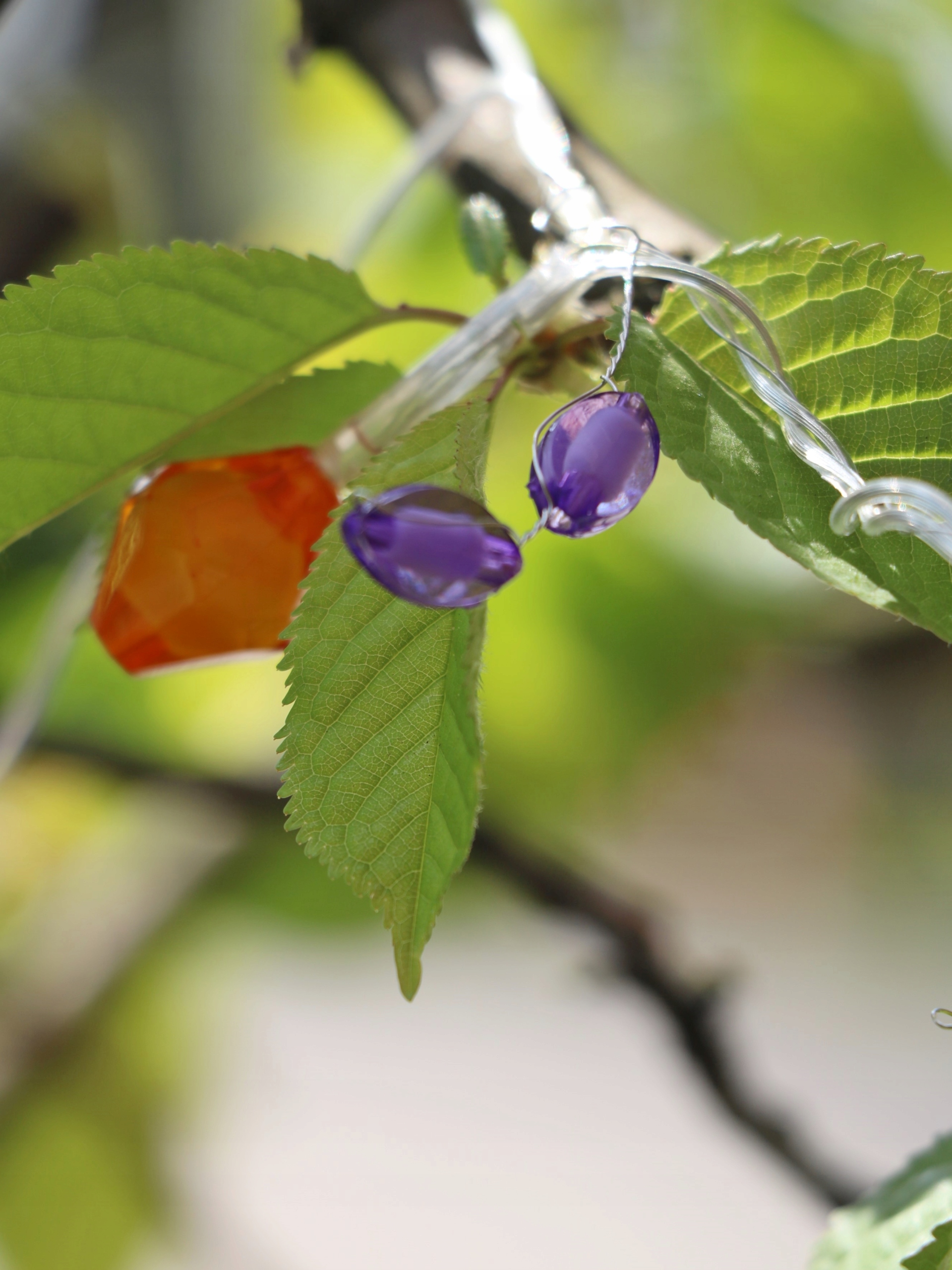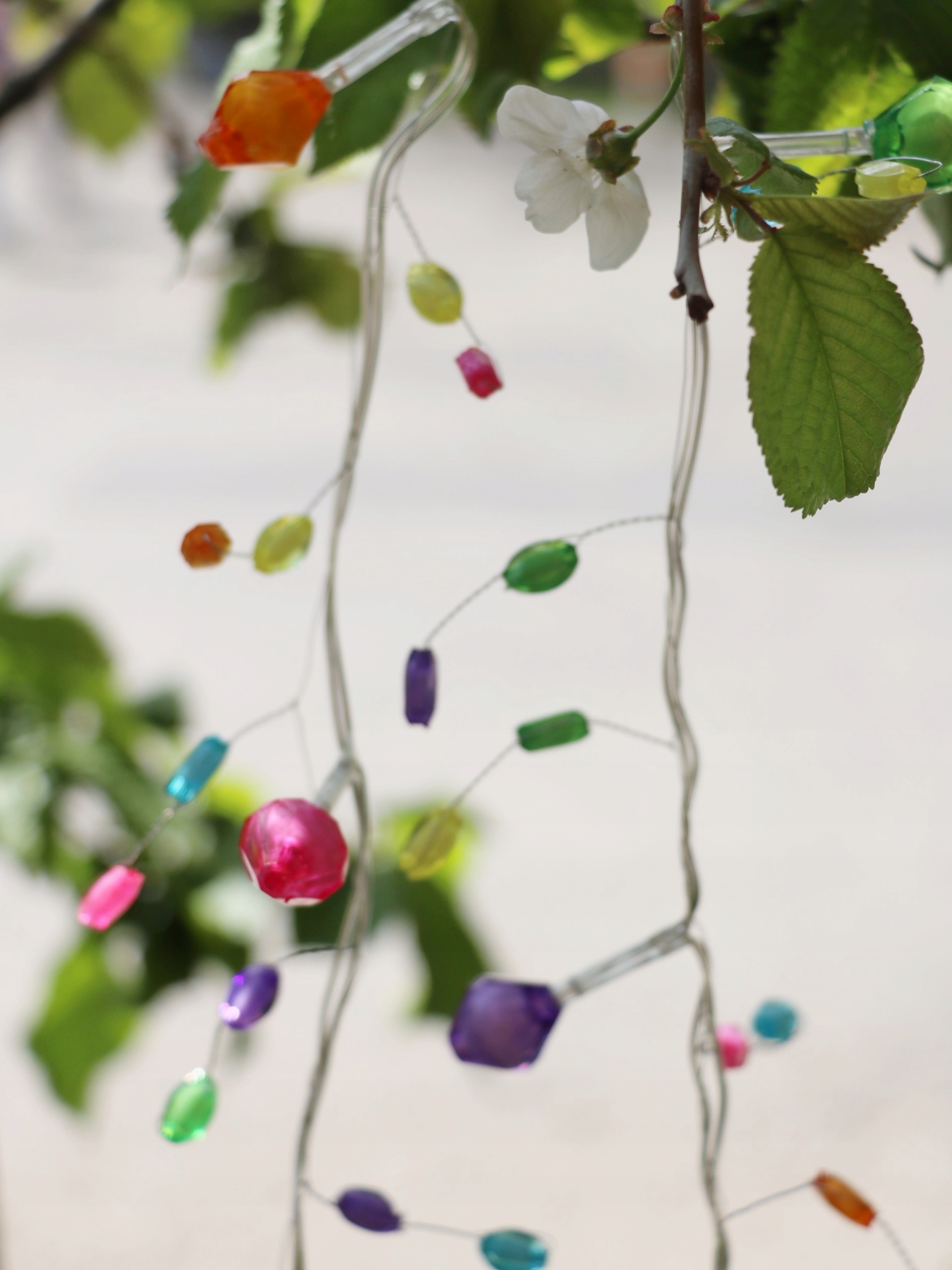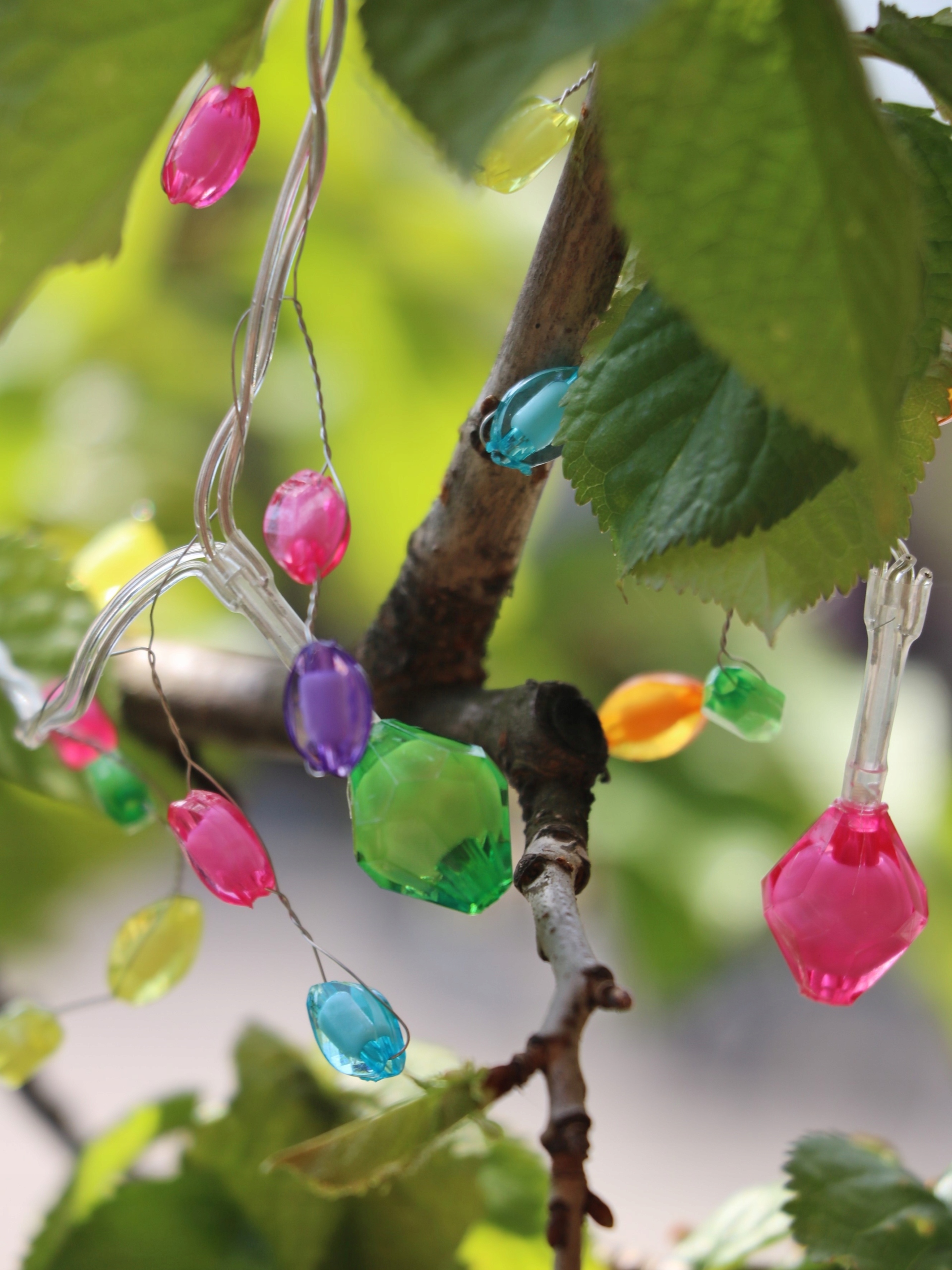 Цепочка состоит из 10 теплых диодов и разноцветных подвесок