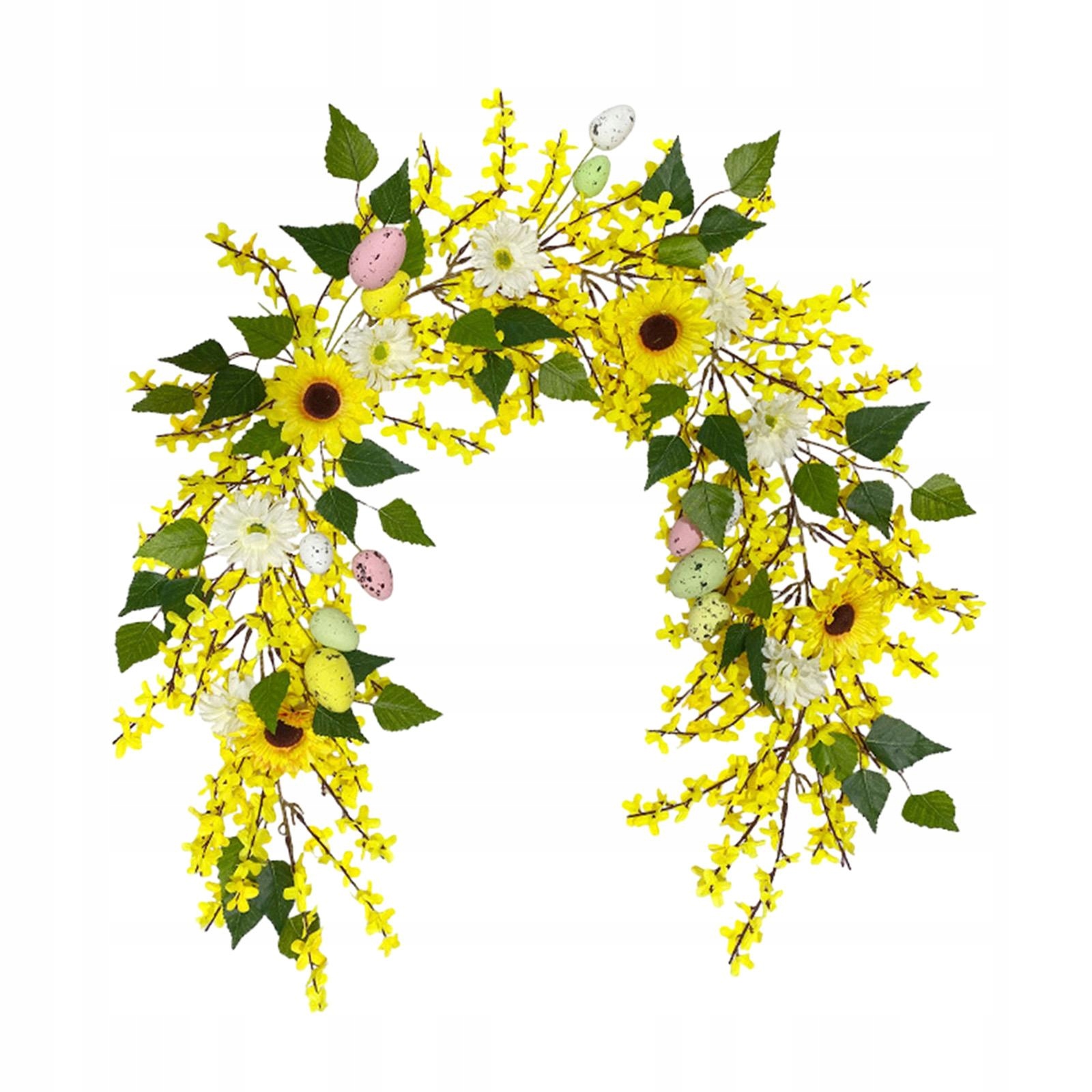 [Отчет] Гирлянда с цветами пасхального яйца с разноцветными яйцами, искусственными подсолнухами, желтыми цветами, ветвями и зелеными листьями, красивыми и яркими.