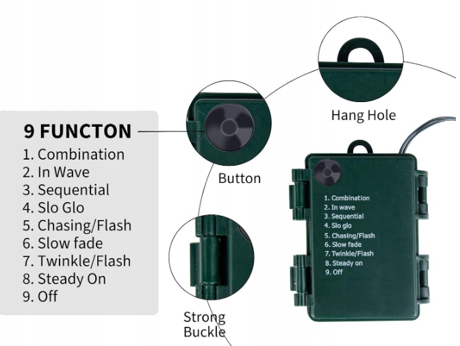 Контроллер имеет 9 режимов освещения, включая постоянный свет, мягкий пульсирующий, последовательный и волновой эффект. Управление простое: одна кнопка меняет режим, а корпус устойчив к внешним воздействиям.
