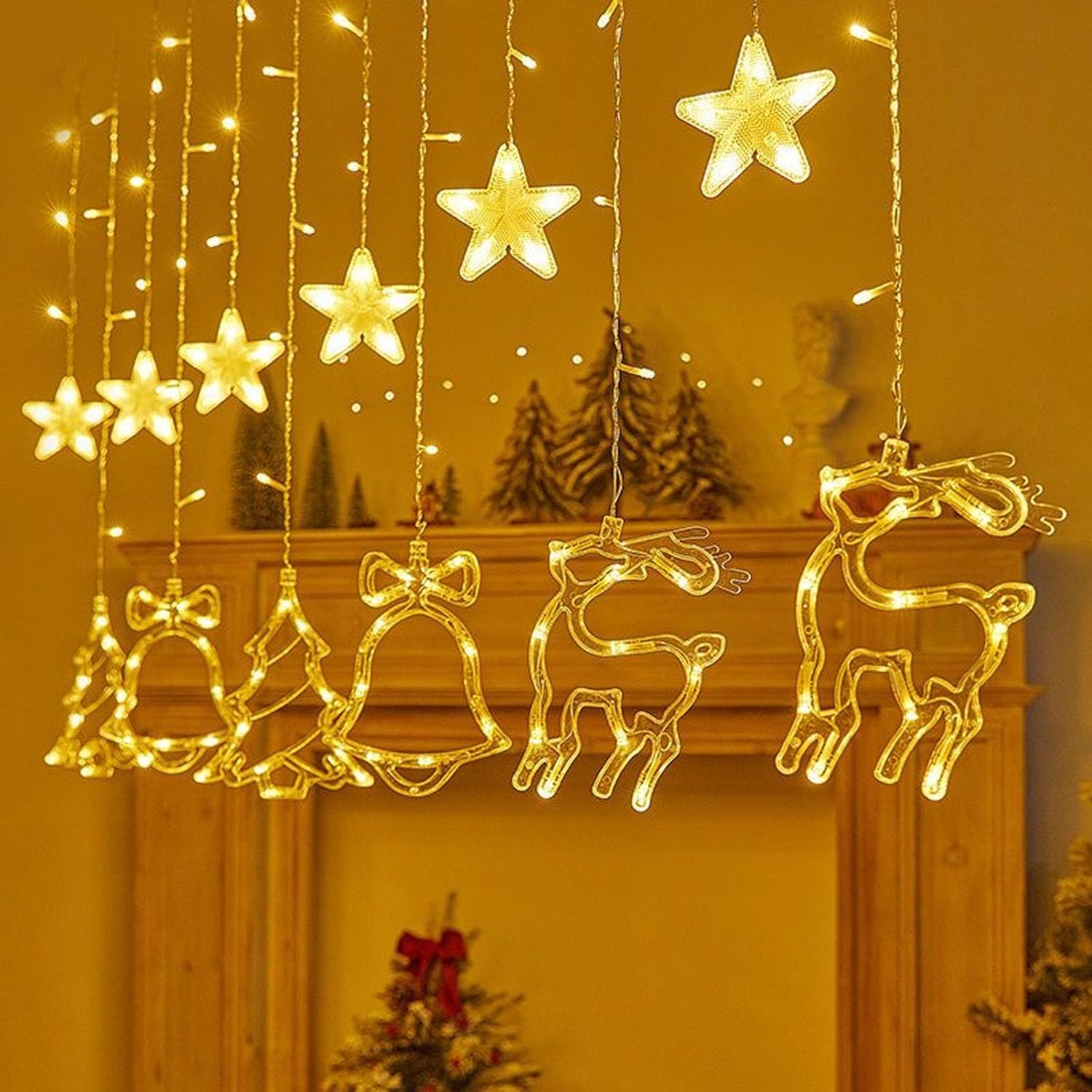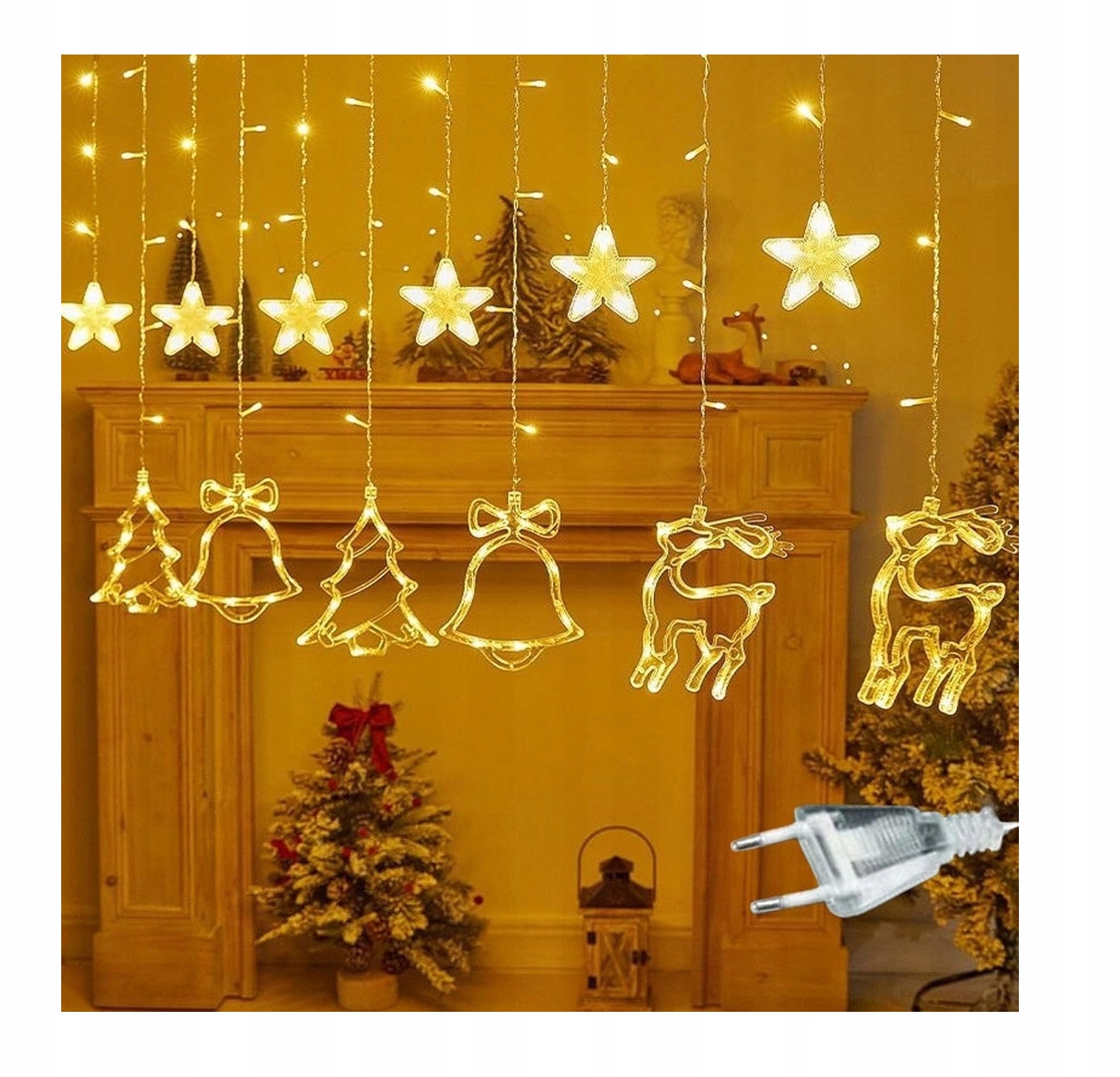 Высокое качество: это очень красивые елочные гирлянды. Звезда, олень, елка и колокольчик большие, изготовлены из высококачественного бисера с высокой яркостью и низким энергопотреблением. После многих часов использования они не нагреваются даже на ощупь. Теплая белая световая завеса безопасна в использовании, водонепроницаема, энергосберегающая, прочная и экологически чистая. Теплый свет создает теплую, радостную и праздничную атмосферу.
