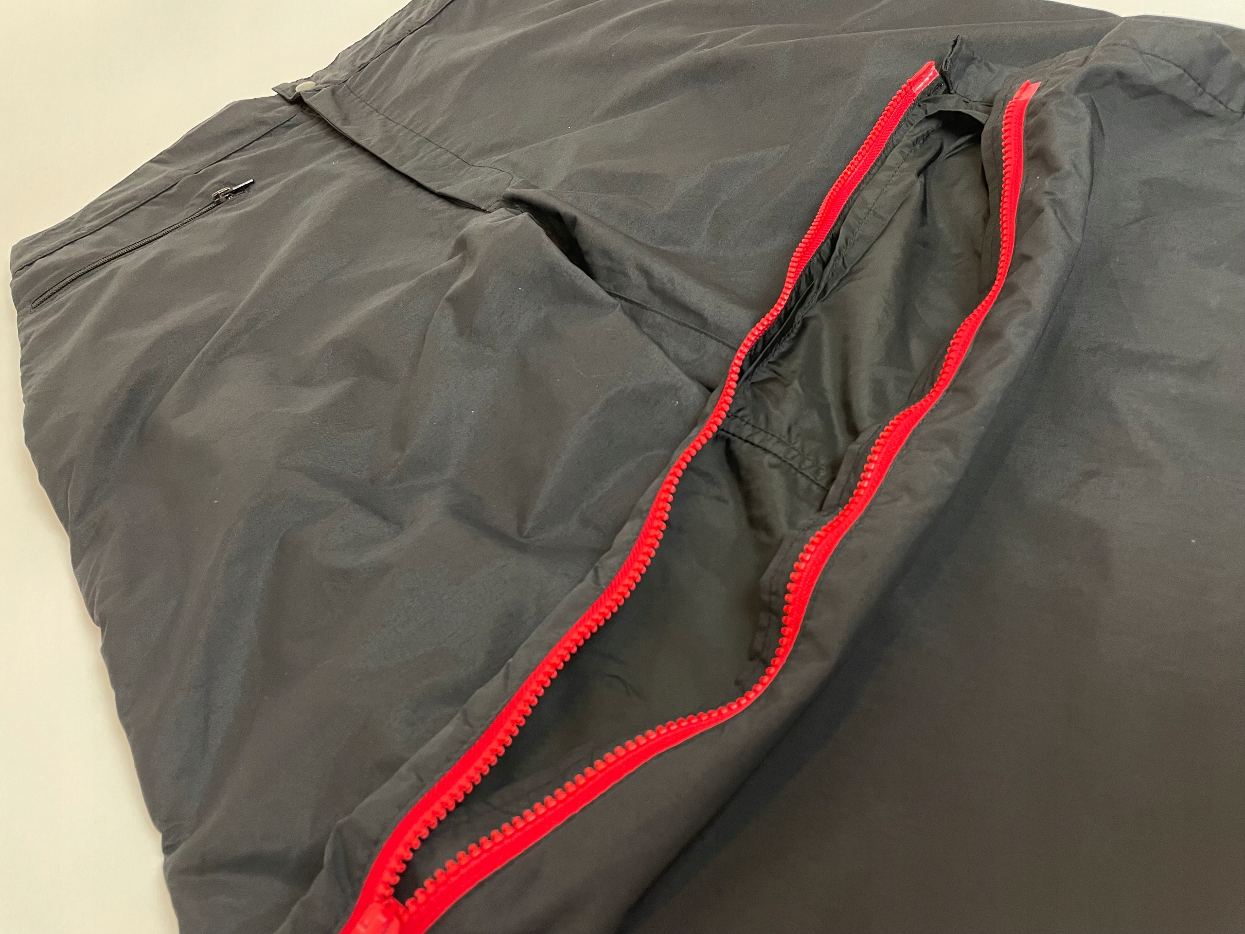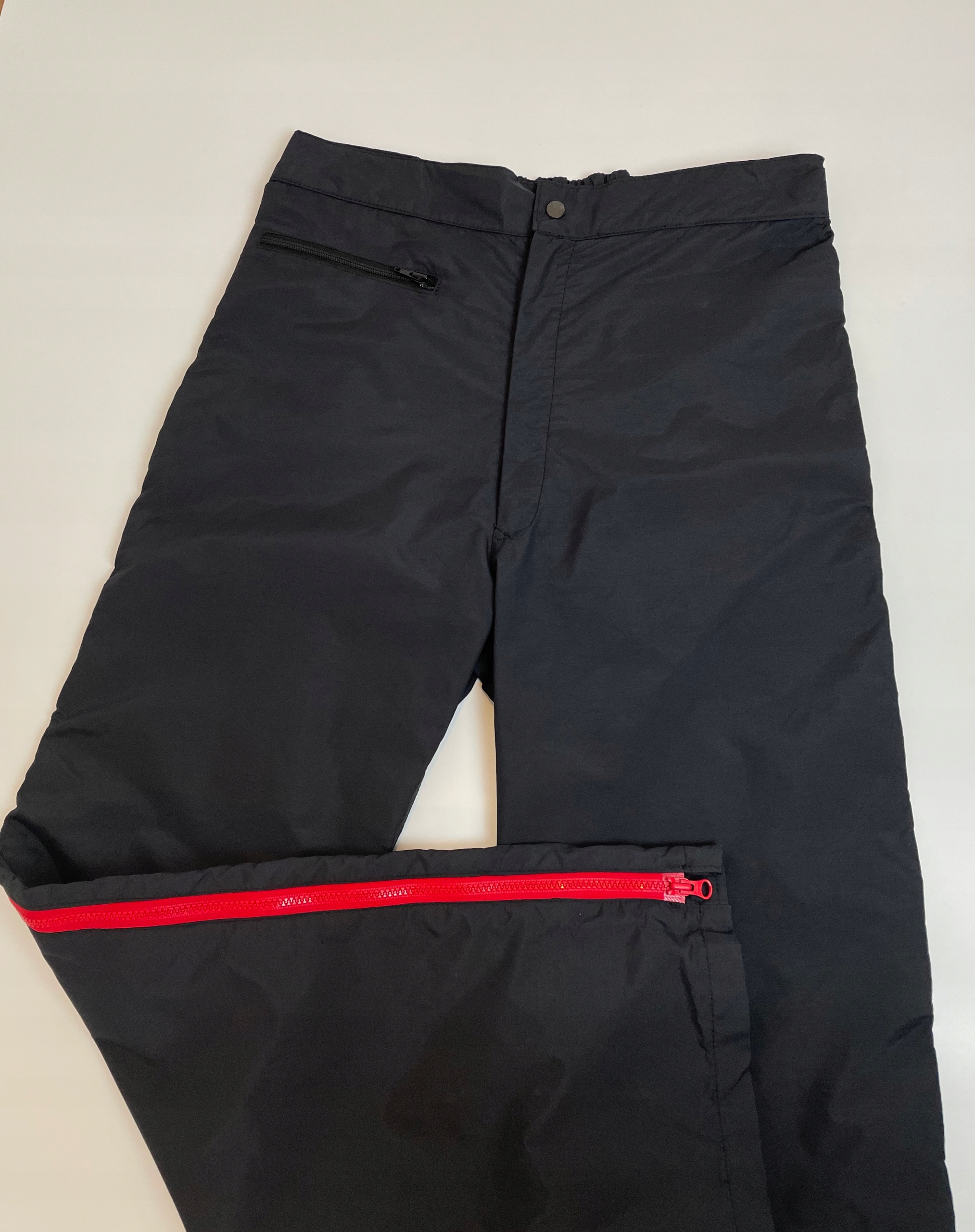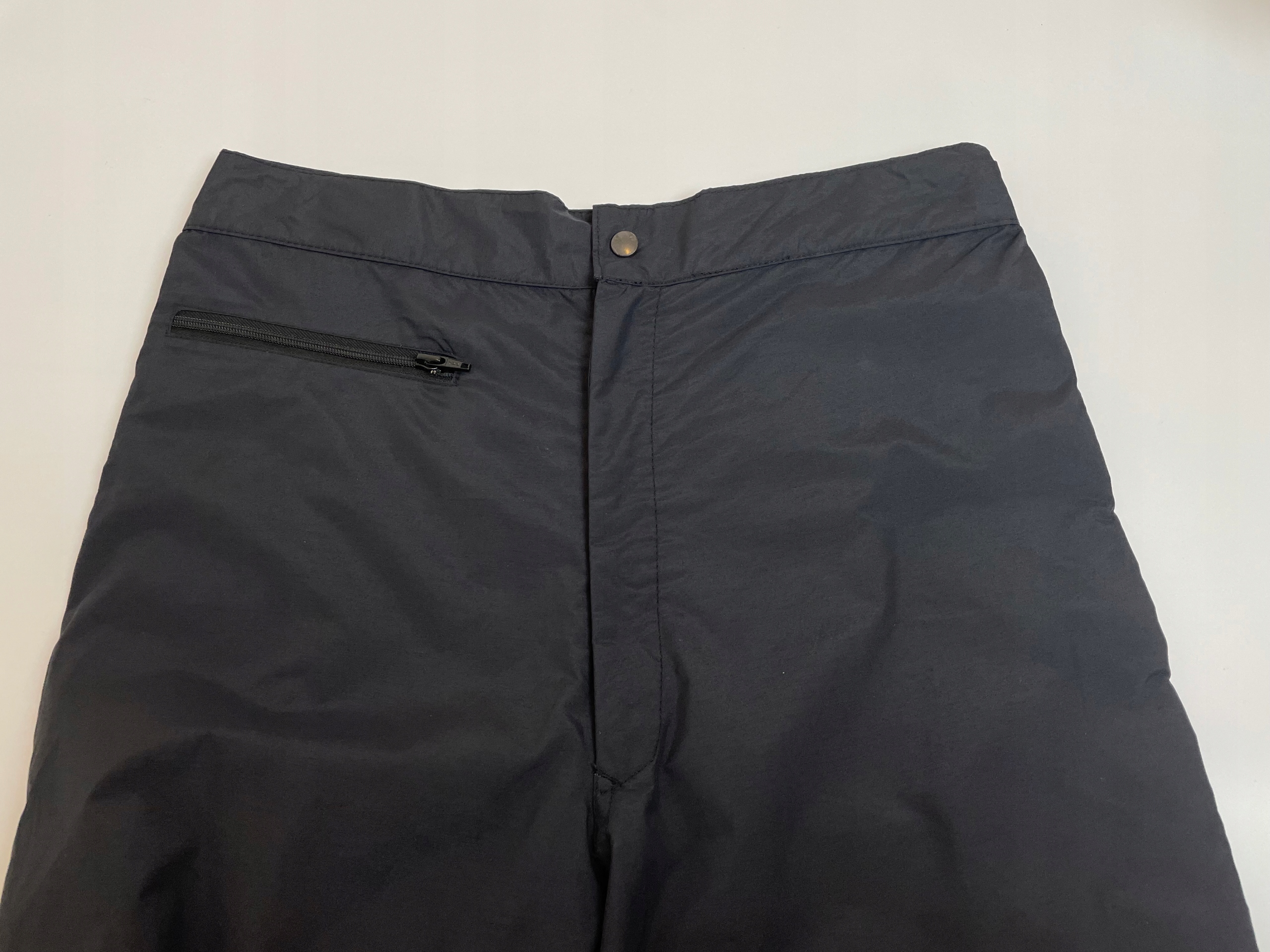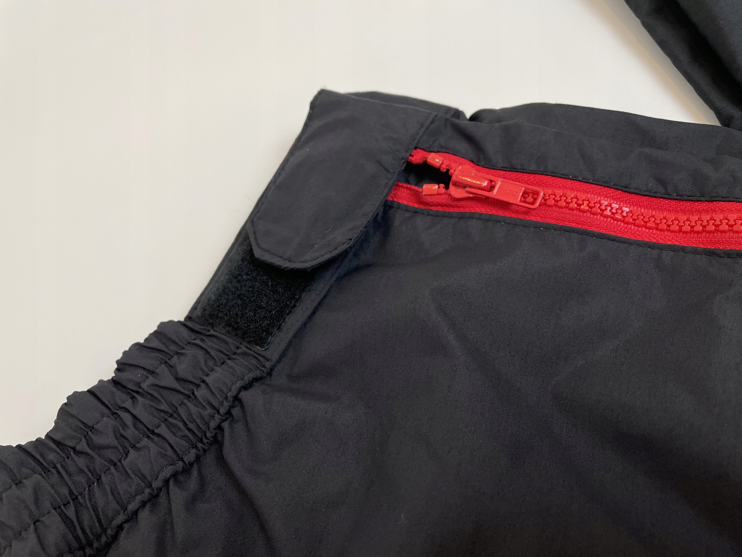 Черные лыжные брюки. Застегивается на талии на кнопку и молнию, регулируется застежкой-липучкой. Брюки водонепроницаемые. Они были сделаны из нейлона. У них есть красные молнии с обеих сторон штанин. Такое решение позволяет легко надевать их даже при ношении тяжелой обуви. Штаны легкие. Их качество изготовления очень прочное. Идеально подходят для зимних видов спорта.