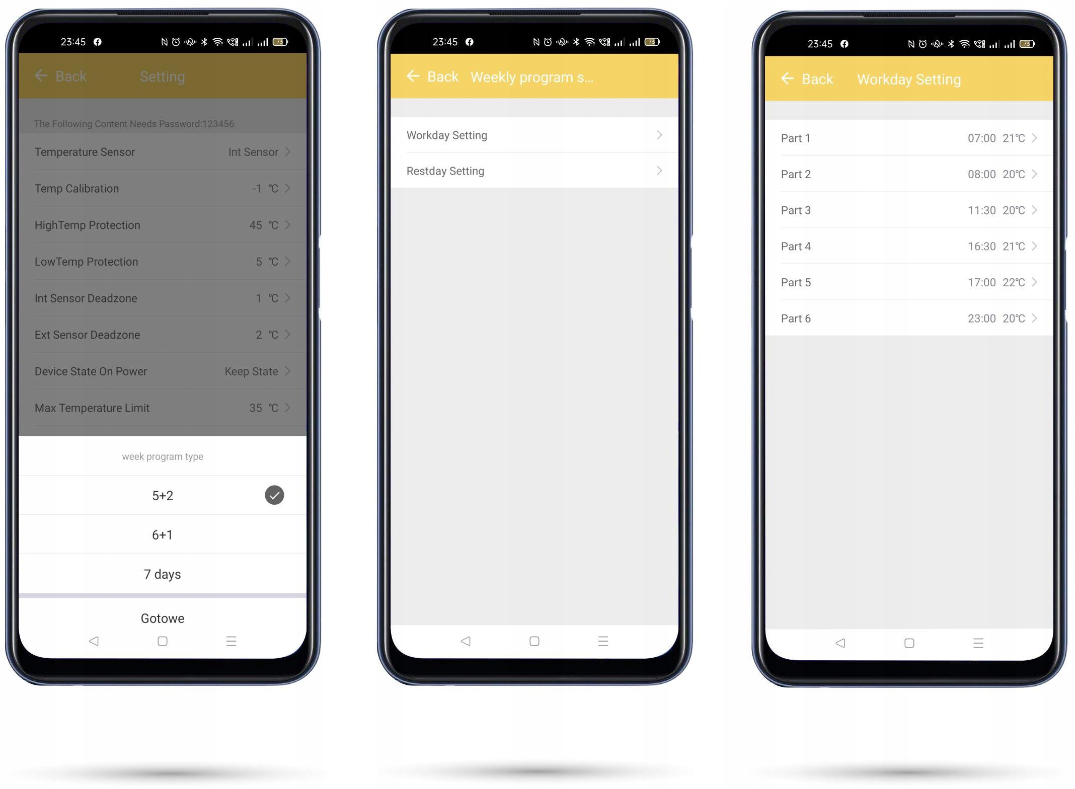 ⭐ График работы позволяет устанавливать температуру в 6 временных интервалах и расположение рабочих и выходных дней в вариантах 5+2, 6+1 или 7 дней.