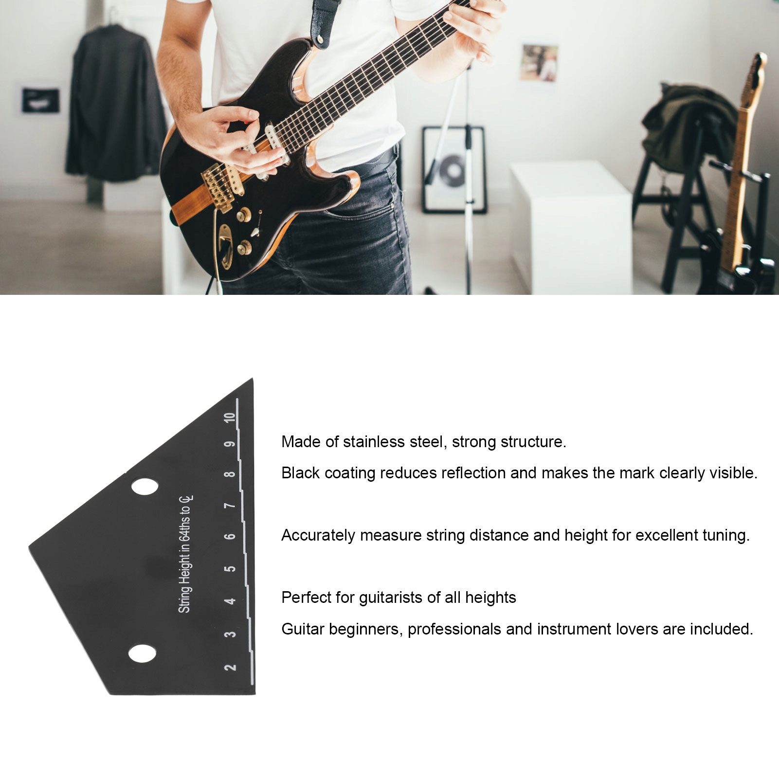 Функция: 1. Сплошная конструкция: изготовлен из нержавеющей стали, этот счетчик высоты гитары обеспечивает твердую конструкцию. Черная мована уменьшает блики, делая маркировку яркими и видимыми.